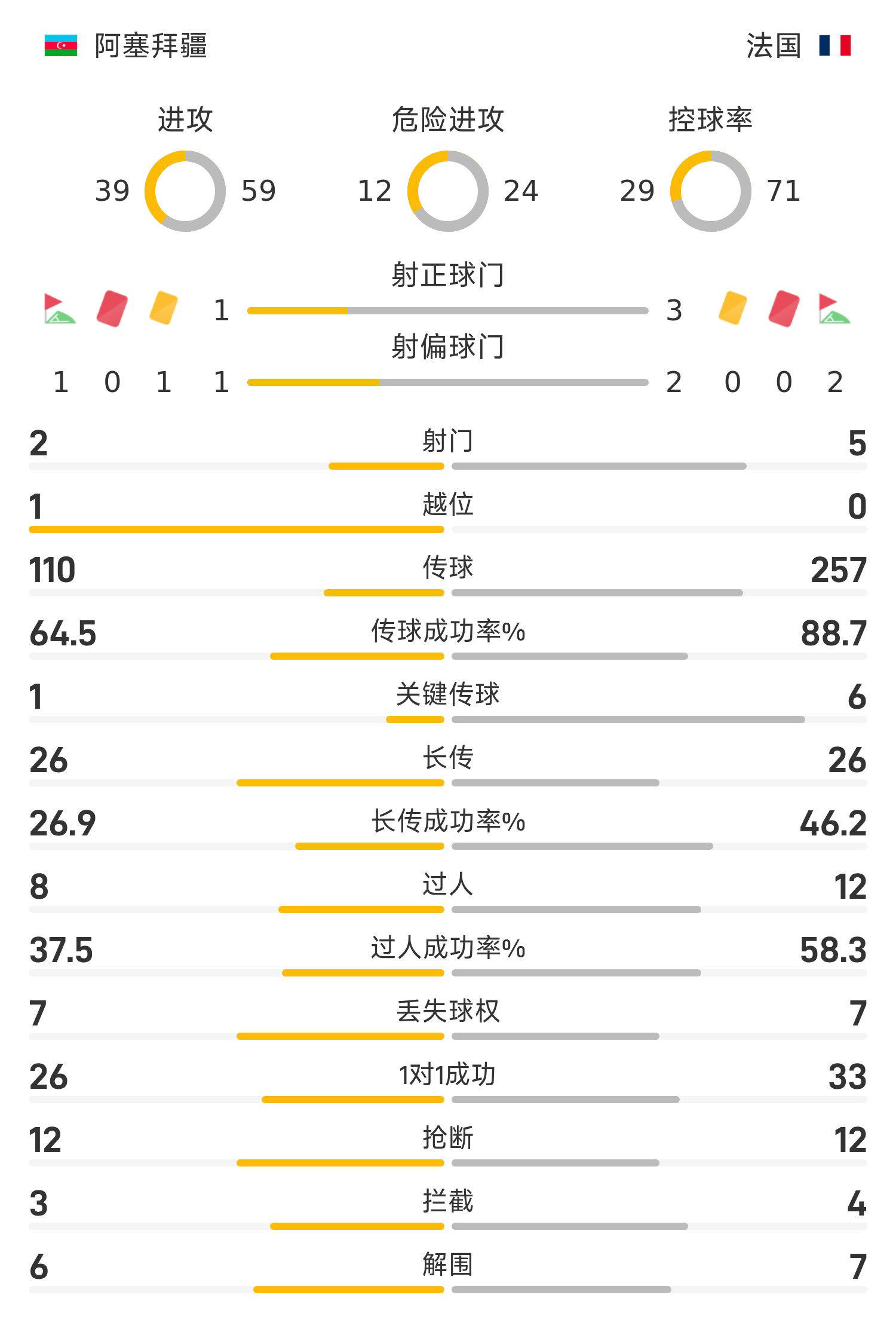 45’圖拉姆門前搶點(diǎn)撞射,門將馬哈瑪達(dá)利耶夫撲救不慎自擺烏龍,法國3-1阿塞拜疆