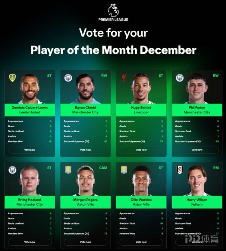 英超12月最佳球員候選:哈蘭德、謝爾基、埃基蒂克、福登在列