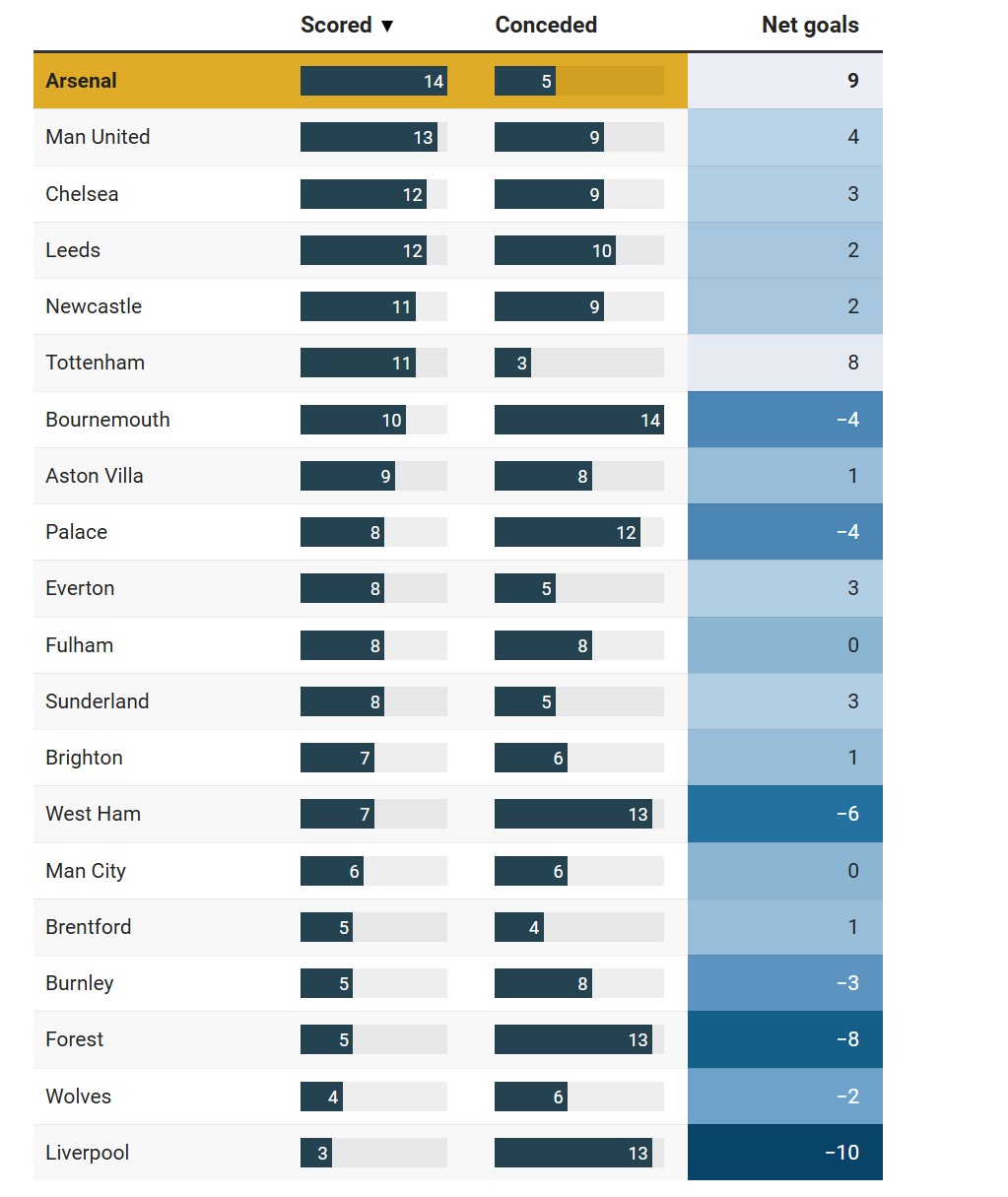 (圖片顯示:阿森納是本賽季英超定位球進(jìn)球最多的球隊(duì),進(jìn)14球失5球,凈勝9球)