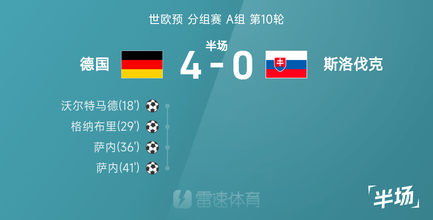 雷速體育11月18日訊 26賽季世歐預(yù)分組賽A組第10輪,德國(guó)迎戰(zhàn)斯洛伐克。半場(chǎng)戰(zhàn)罷,雙方比分暫為德國(guó)4-0斯洛伐克,薩內(nèi)上演梅開(kāi)二度。