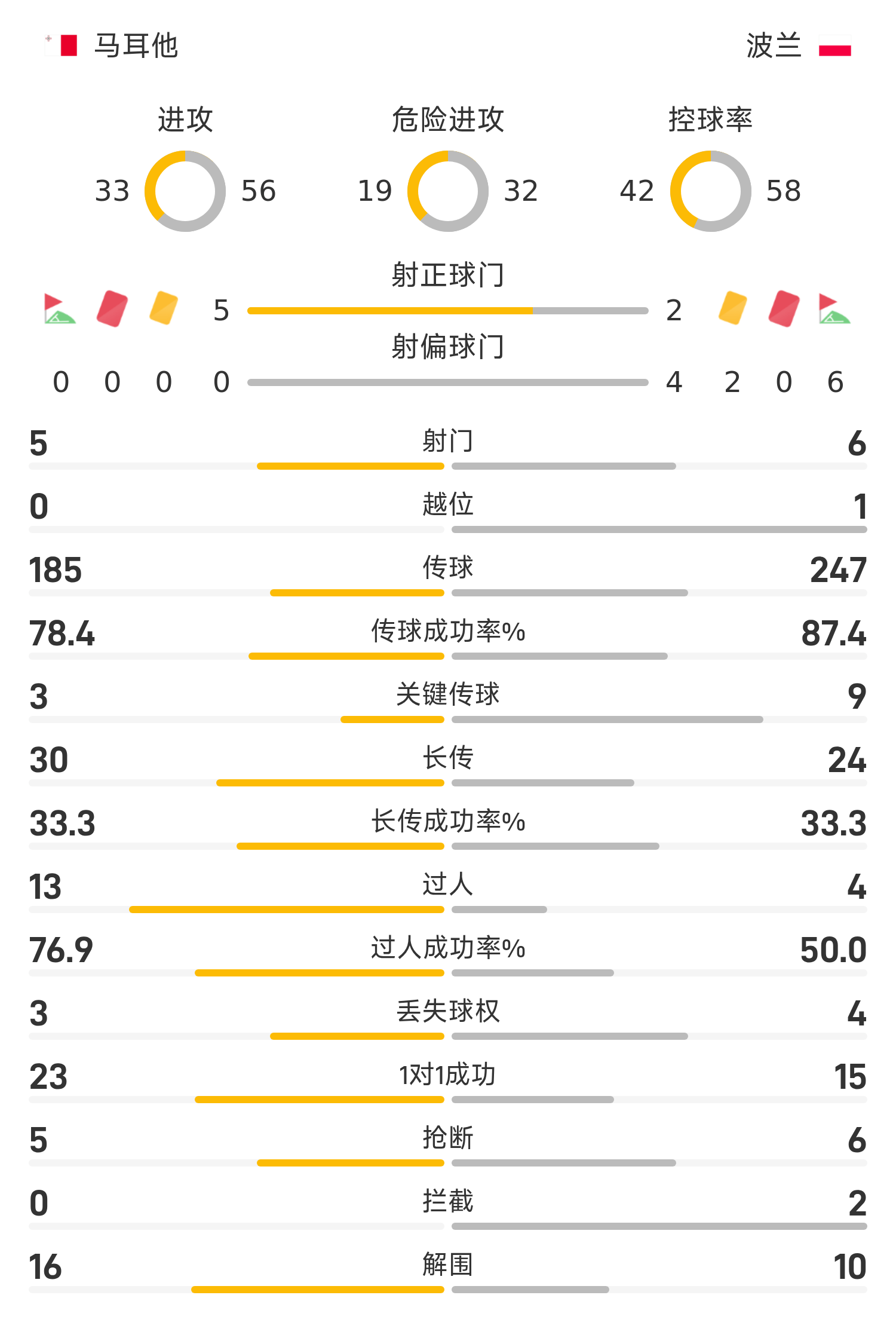 36’丘亞雷夫傳中,卡多納門(mén)前混戰(zhàn)得手,馬耳他1-1扳平波蘭