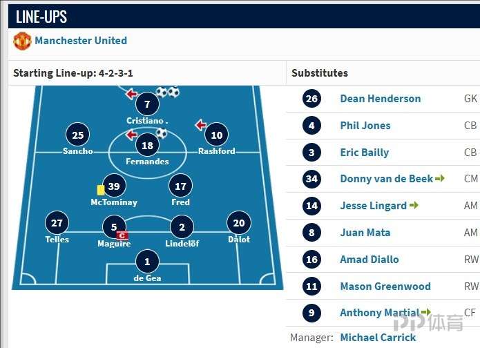 替補席則是:迪恩·亨德森、菲爾·瓊斯、拜利、范德貝克、林加德、馬塔、阿瑪?shù)隆⒏窳治榈隆ⅠR夏爾。