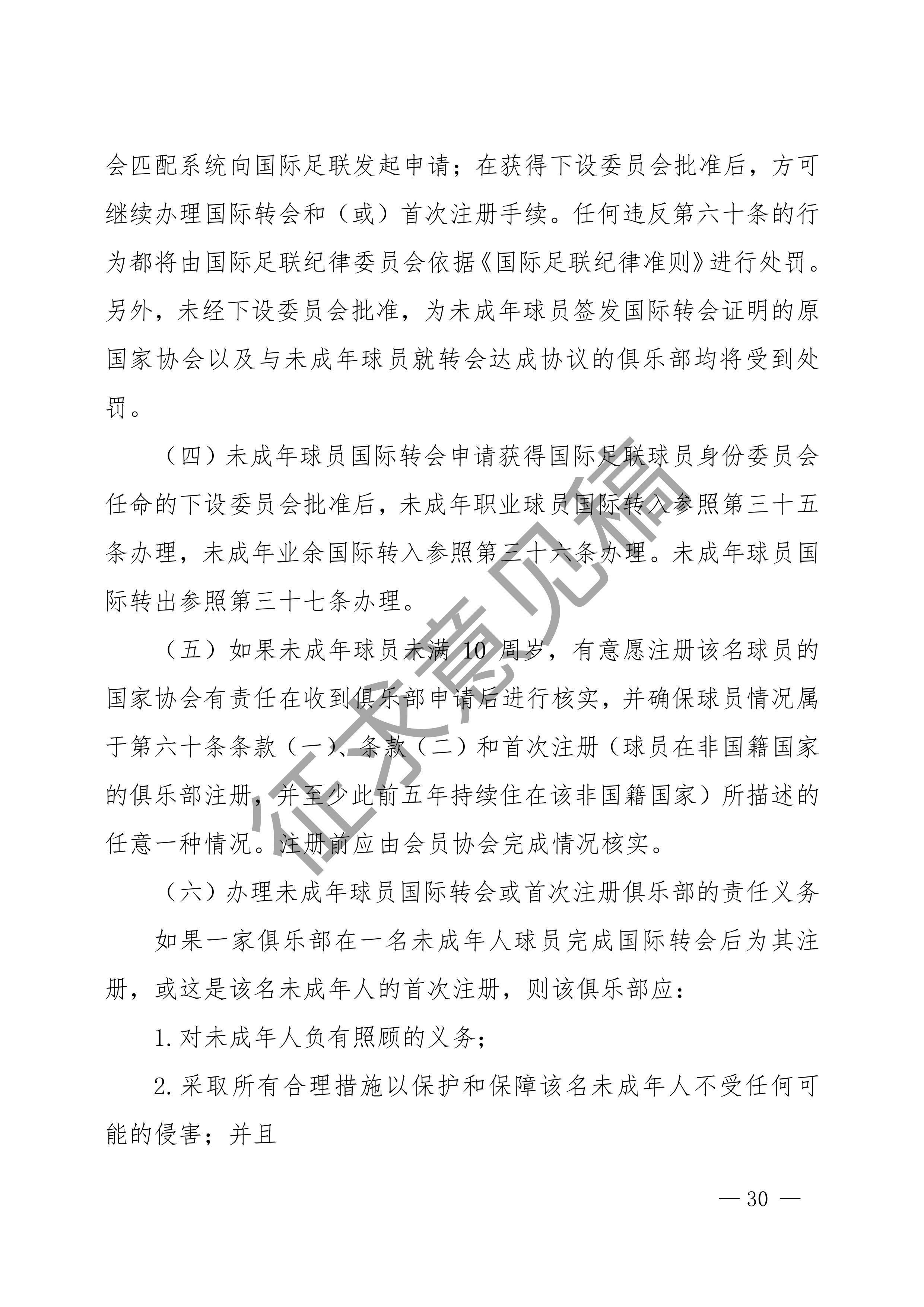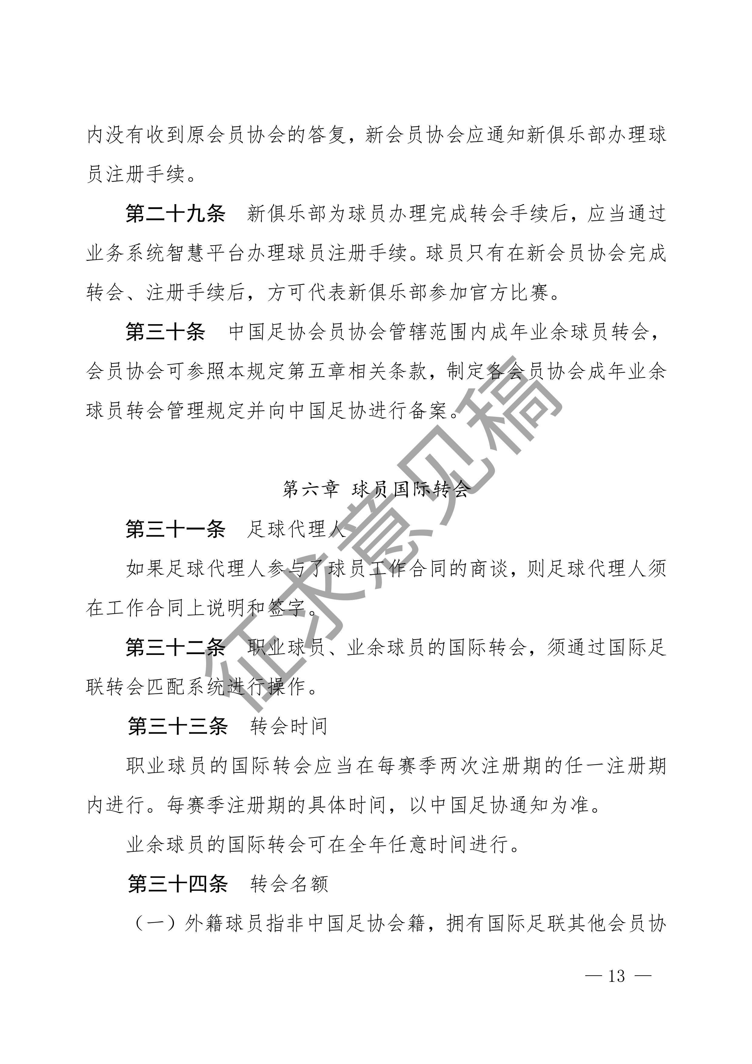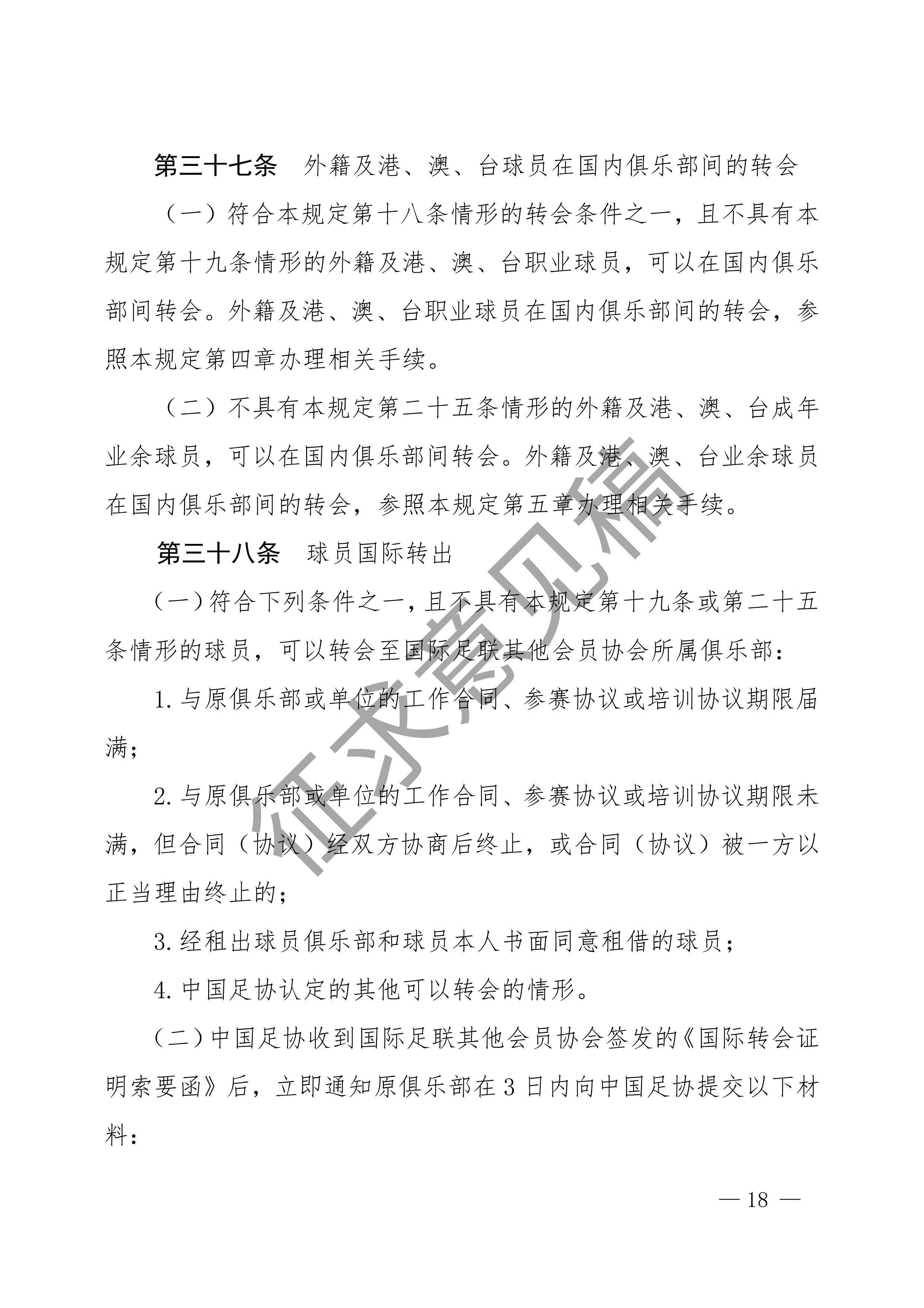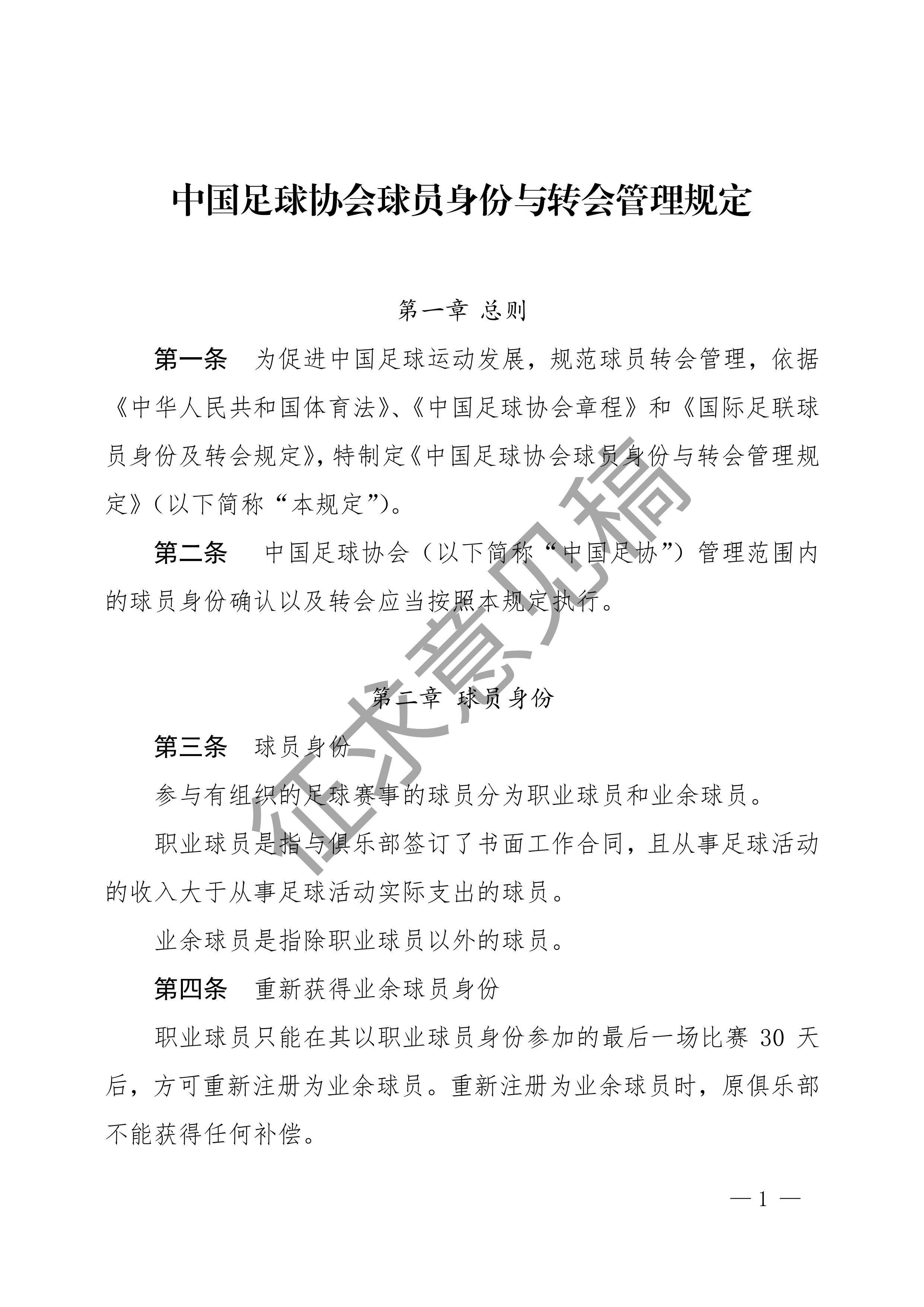 為進(jìn)一步規(guī)范我國(guó)球員身份與轉(zhuǎn)會(huì)管理工作,推動(dòng)球員身份認(rèn)定與轉(zhuǎn)會(huì)流程與國(guó)際足球接軌,根據(jù)最近版《國(guó)際足聯(lián)球員身份與轉(zhuǎn)會(huì)規(guī)定》,中國(guó)足球協(xié)會(huì)起草了新版本《中國(guó)足球協(xié)會(huì)球員身份與轉(zhuǎn)會(huì)管理規(guī)定(征求意見(jiàn)稿)》。