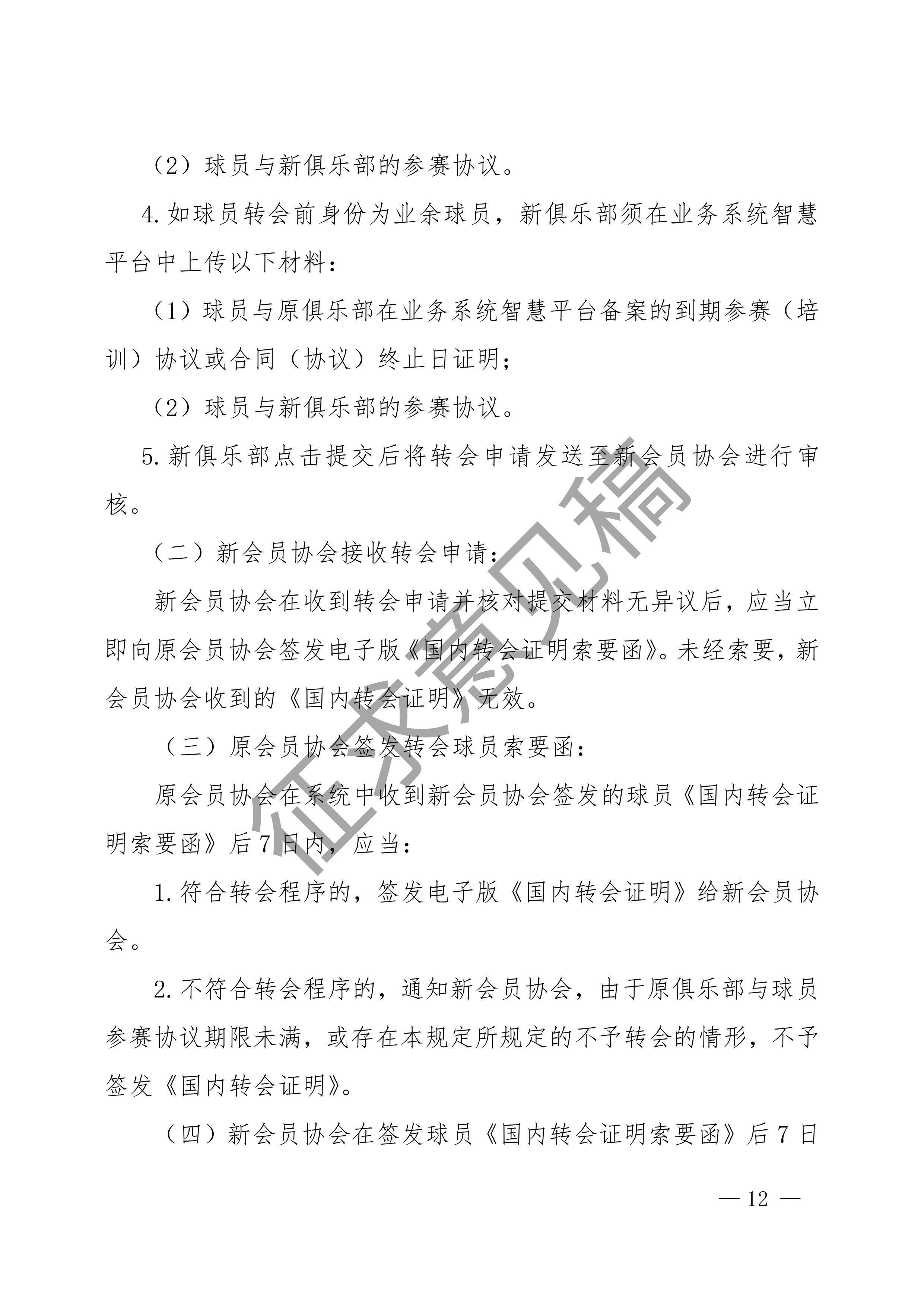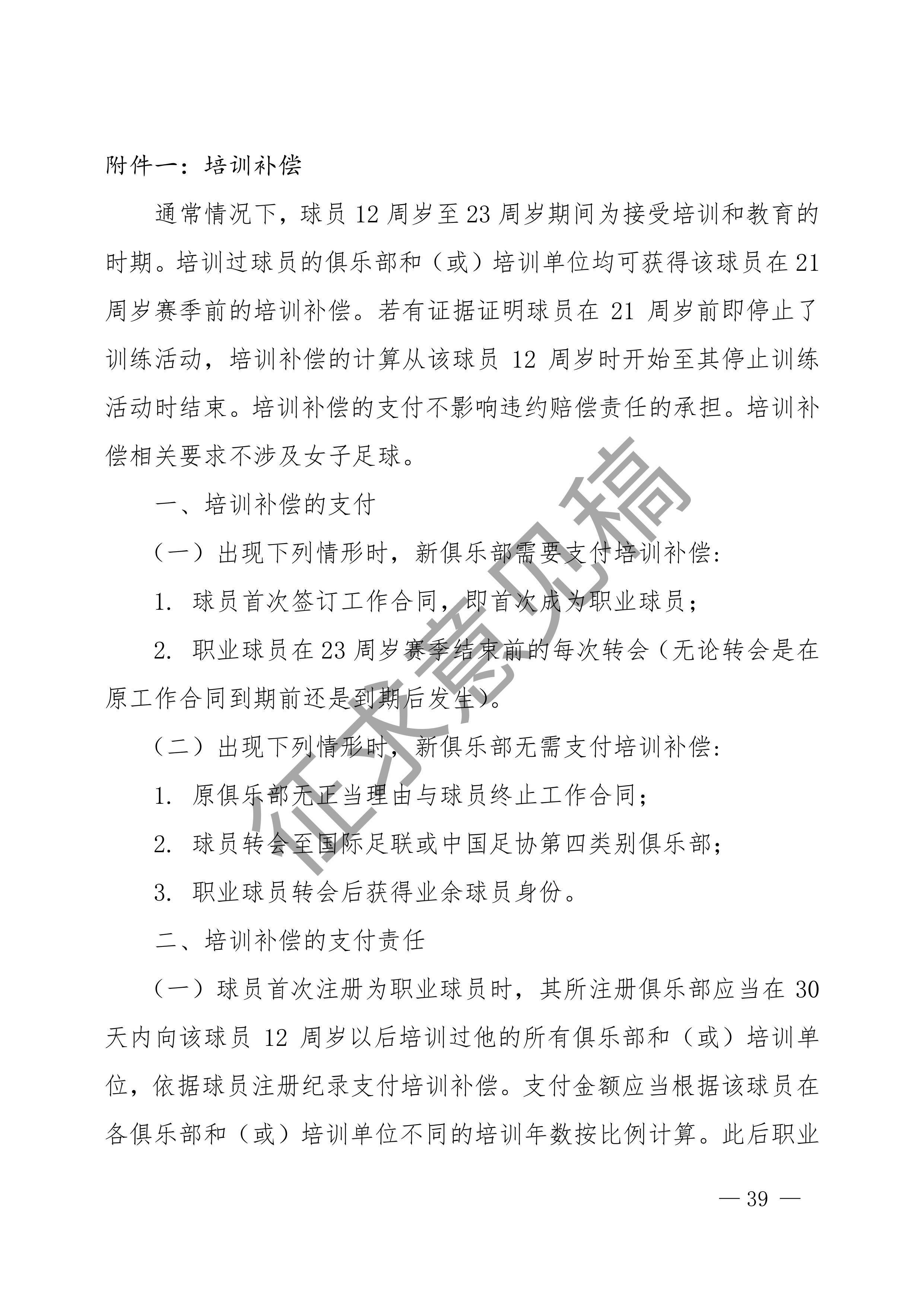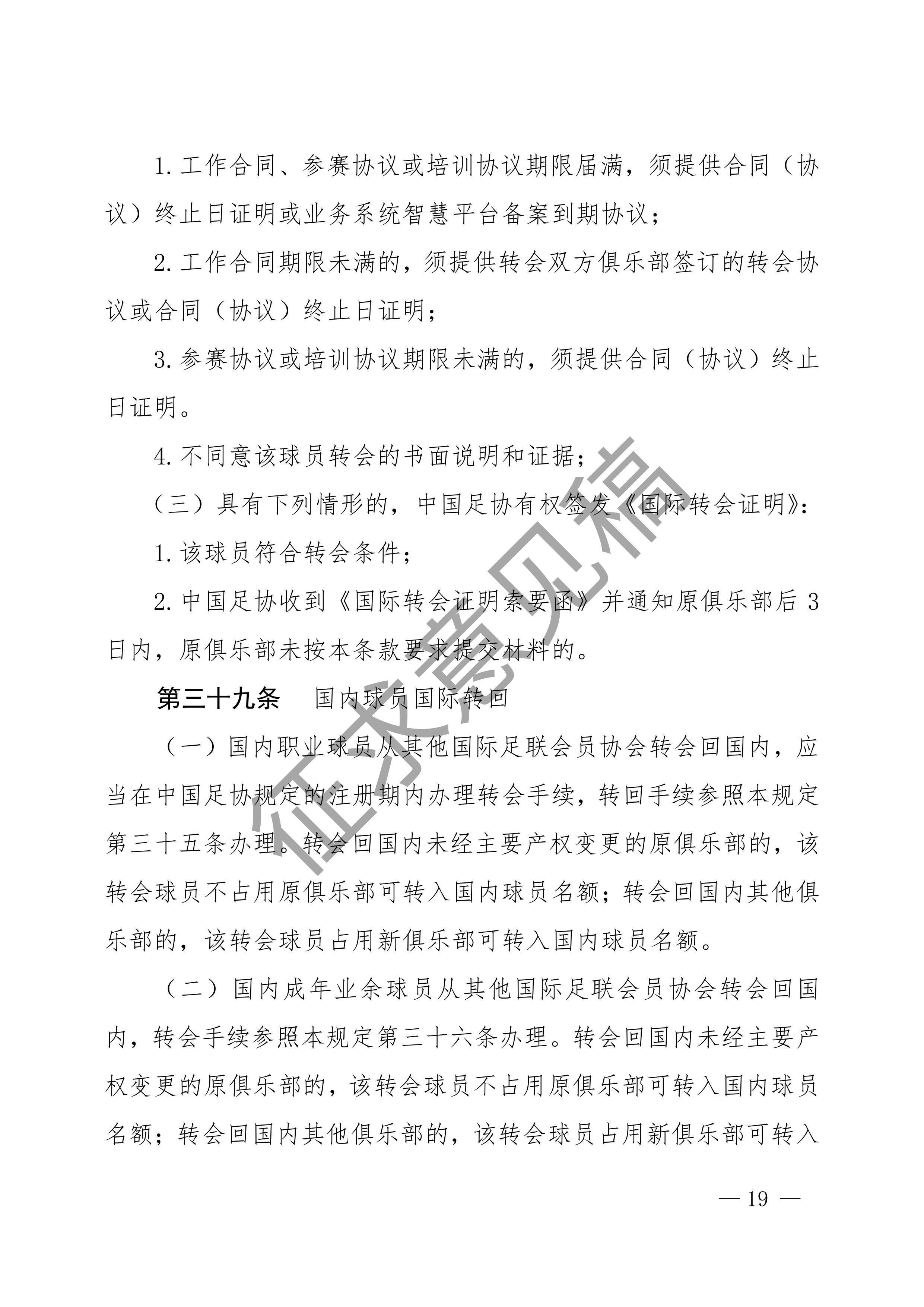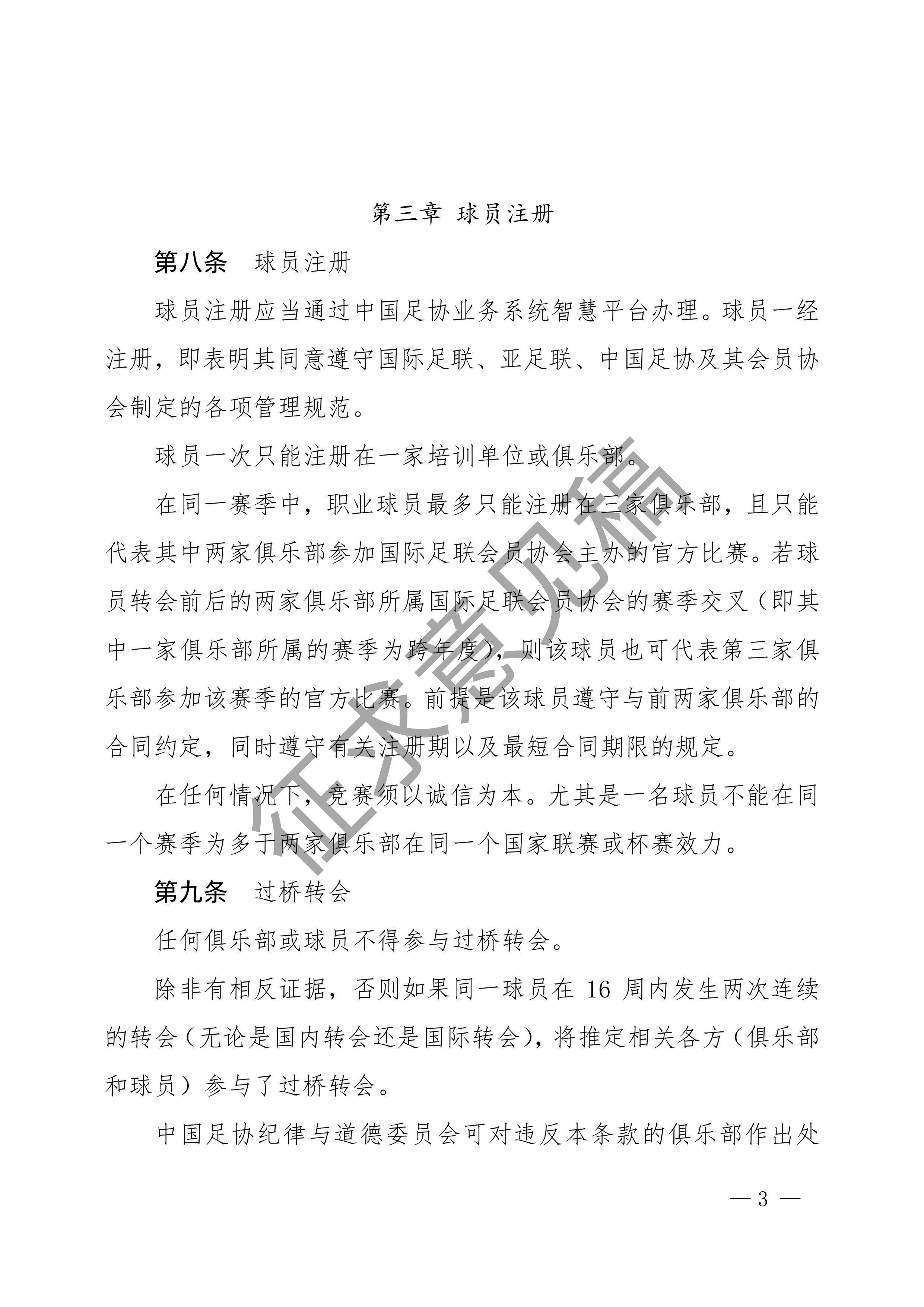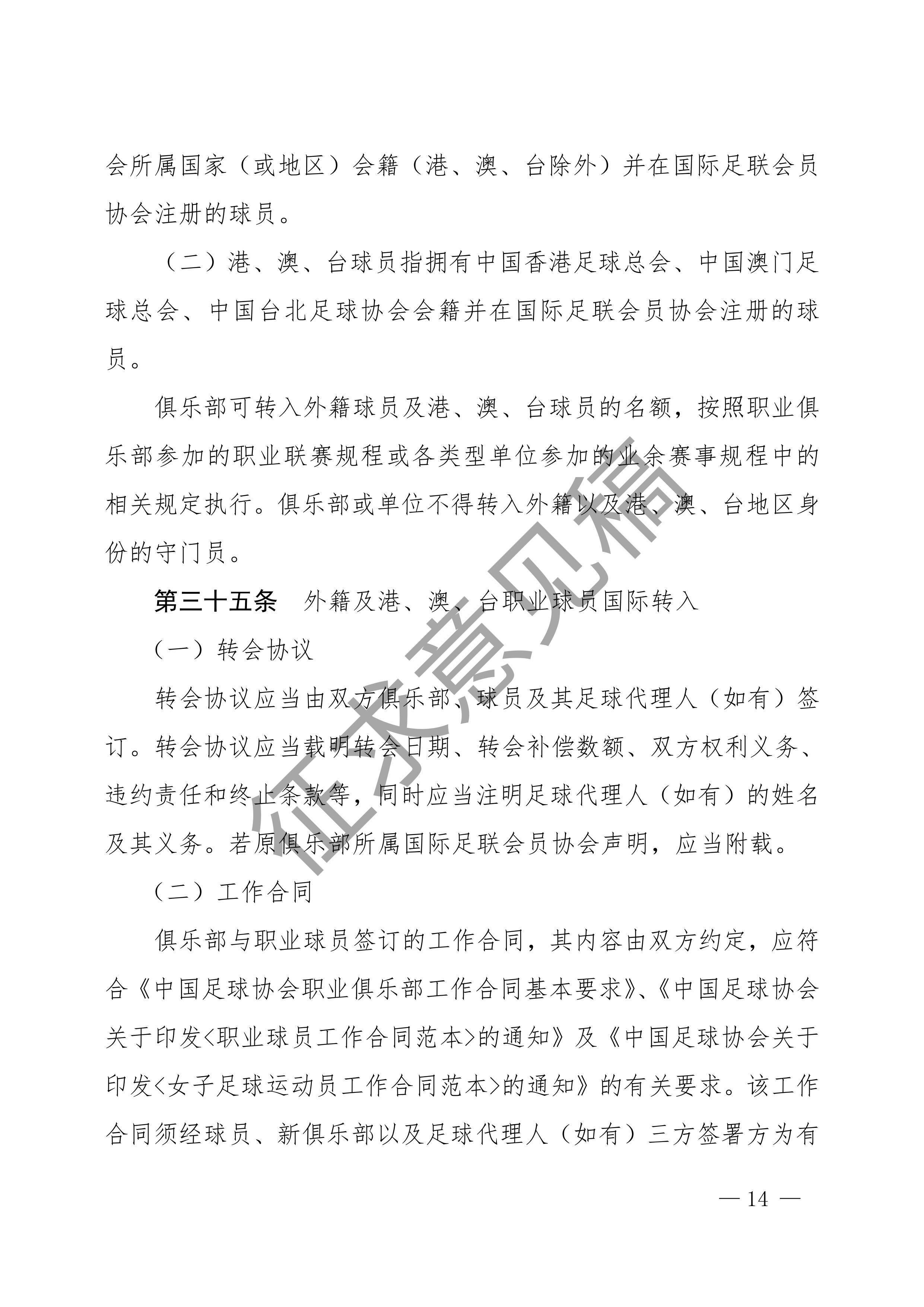為進(jìn)一步規(guī)范我國(guó)球員身份與轉(zhuǎn)會(huì)管理工作,推動(dòng)球員身份認(rèn)定與轉(zhuǎn)會(huì)流程與國(guó)際足球接軌,根據(jù)最近版《國(guó)際足聯(lián)球員身份與轉(zhuǎn)會(huì)規(guī)定》,中國(guó)足球協(xié)會(huì)起草了新版本《中國(guó)足球協(xié)會(huì)球員身份與轉(zhuǎn)會(huì)管理規(guī)定(征求意見(jiàn)稿)》。