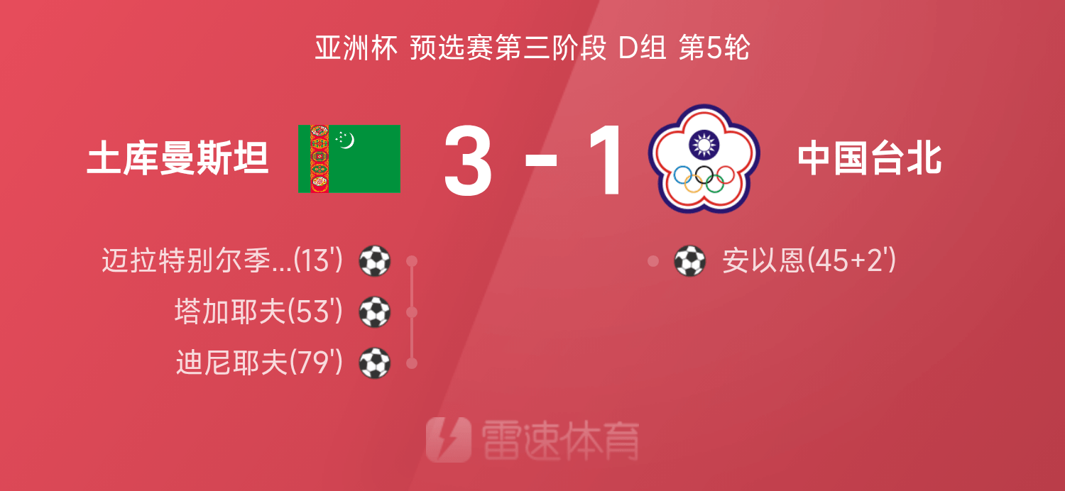 雷速體育11月18日訊 27賽季亞洲杯預(yù)選賽第三階段D組第5輪,土庫曼斯坦3-1戰(zhàn)勝中國臺北。全場比賽,邁拉特別爾季耶夫、塔加耶夫、迪尼耶夫破門建功,安以恩破門難救主。