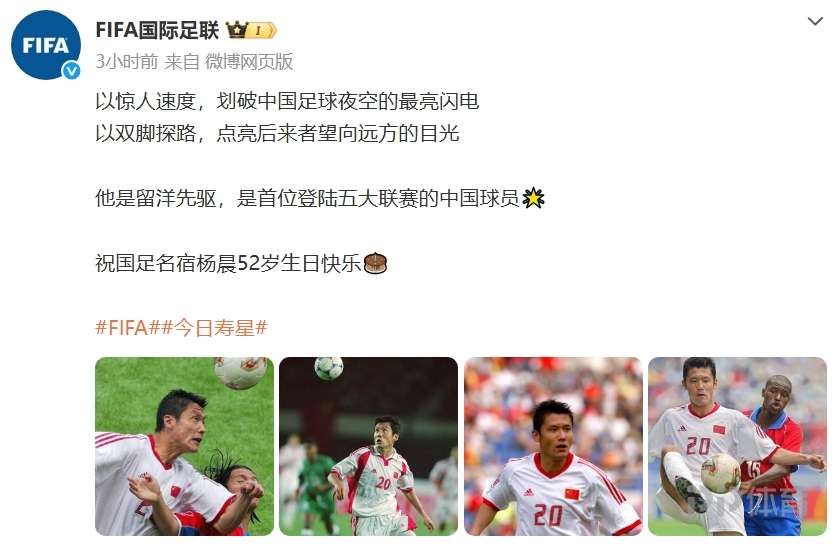 今天是國足名宿楊晨的52歲生日,F(xiàn)IFA國際足聯(lián)官博發(fā)文為其慶祝生日:
