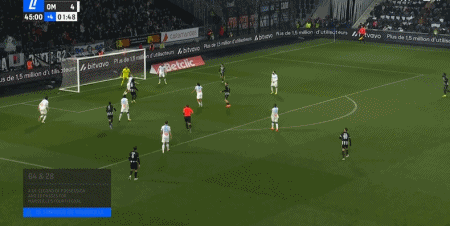 第45+2分鐘,阿明-西巴伊小角度補射破門扳回一分,昂熱1-4馬賽