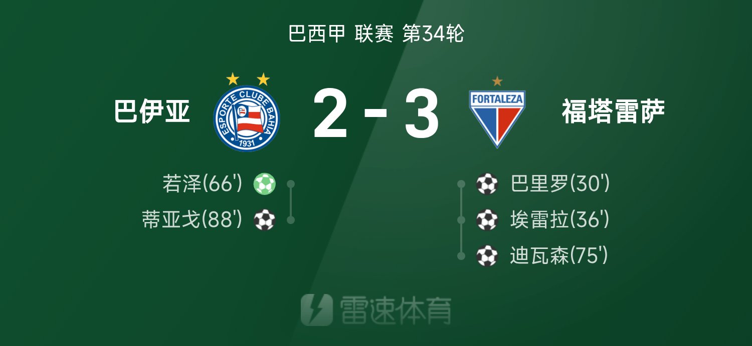 雷速體育11月21日訊 25賽季巴西甲聯(lián)賽第34輪,福塔雷薩3-2戰(zhàn)勝巴伊亞。全場比賽,埃雷拉發(fā)揮出色貢獻(xiàn)1射1傳,巴里羅、迪瓦森破門建功,若澤、蒂亞戈破門難救主。