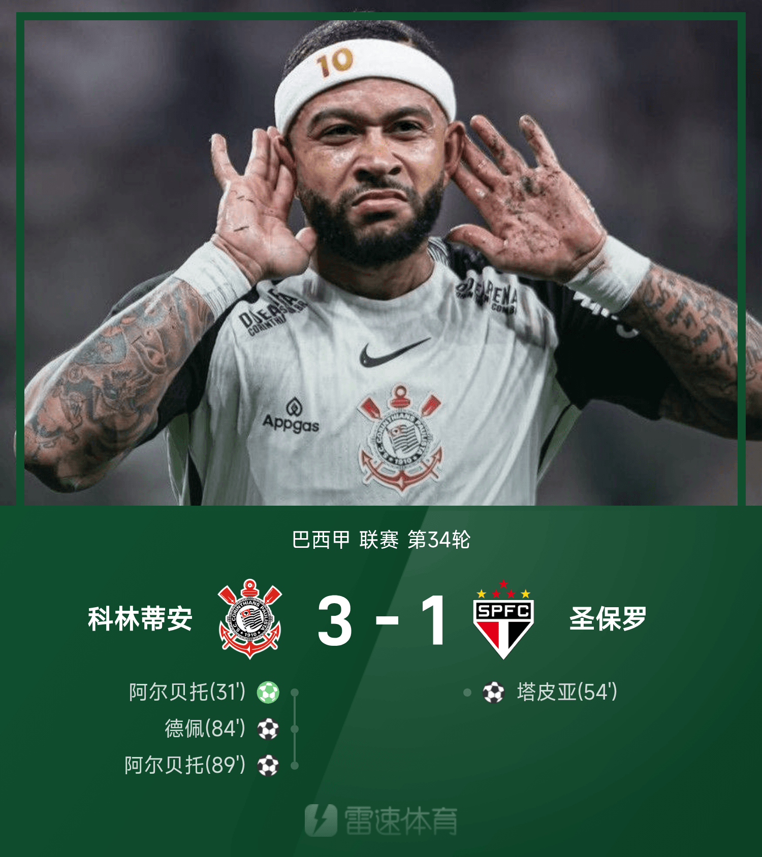 雷速體育11月21日訊 25賽季巴西甲聯(lián)賽第34輪,科林蒂安3-1戰(zhàn)勝圣保羅。全場(chǎng)比賽,阿爾貝托上演梅開(kāi)二度,德佩破門(mén)建功,塔皮亞破門(mén)難救主。