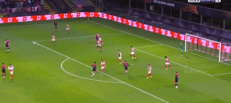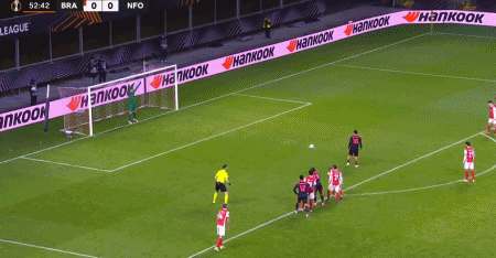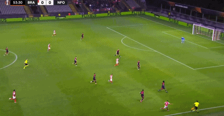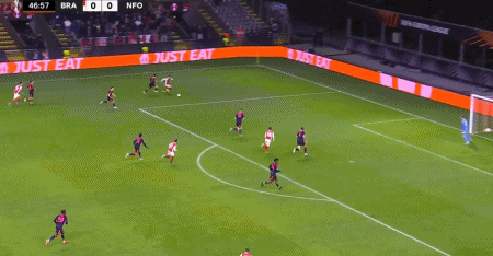 第54分鐘,耶茨回防,不慎將球踢進(jìn)自家球門,布拉加1-0諾丁漢森林