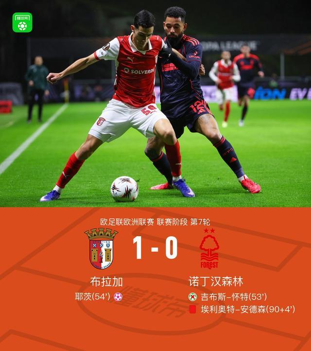 北京時(shí)間1月23日歐足聯(lián)歐洲聯(lián)賽聯(lián)賽階段第7輪,布拉加對(duì)陣諾丁漢森林。諾丁漢森林球員吉布斯-懷特主罰點(diǎn)球未能命中,隨后耶茨不慎自擺烏龍,埃利奧特-安德森在比賽補(bǔ)時(shí)階段被直接罰令出場。最終比分布拉加1-0戰(zhàn)勝諾丁漢森林。