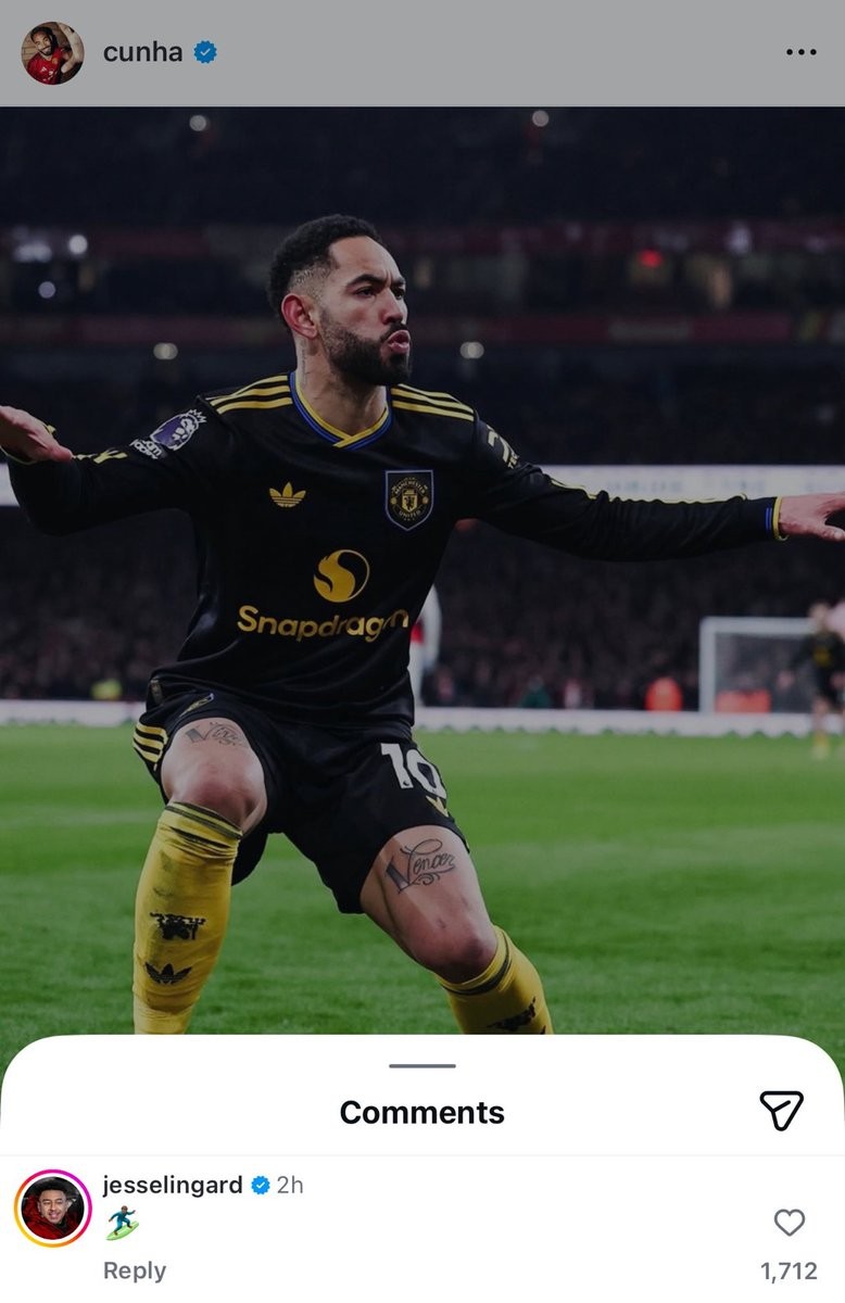 賽后庫尼亞在社媒曬出了自己的慶祝照片,林加德也在社媒積極互動(dòng),他回復(fù)了