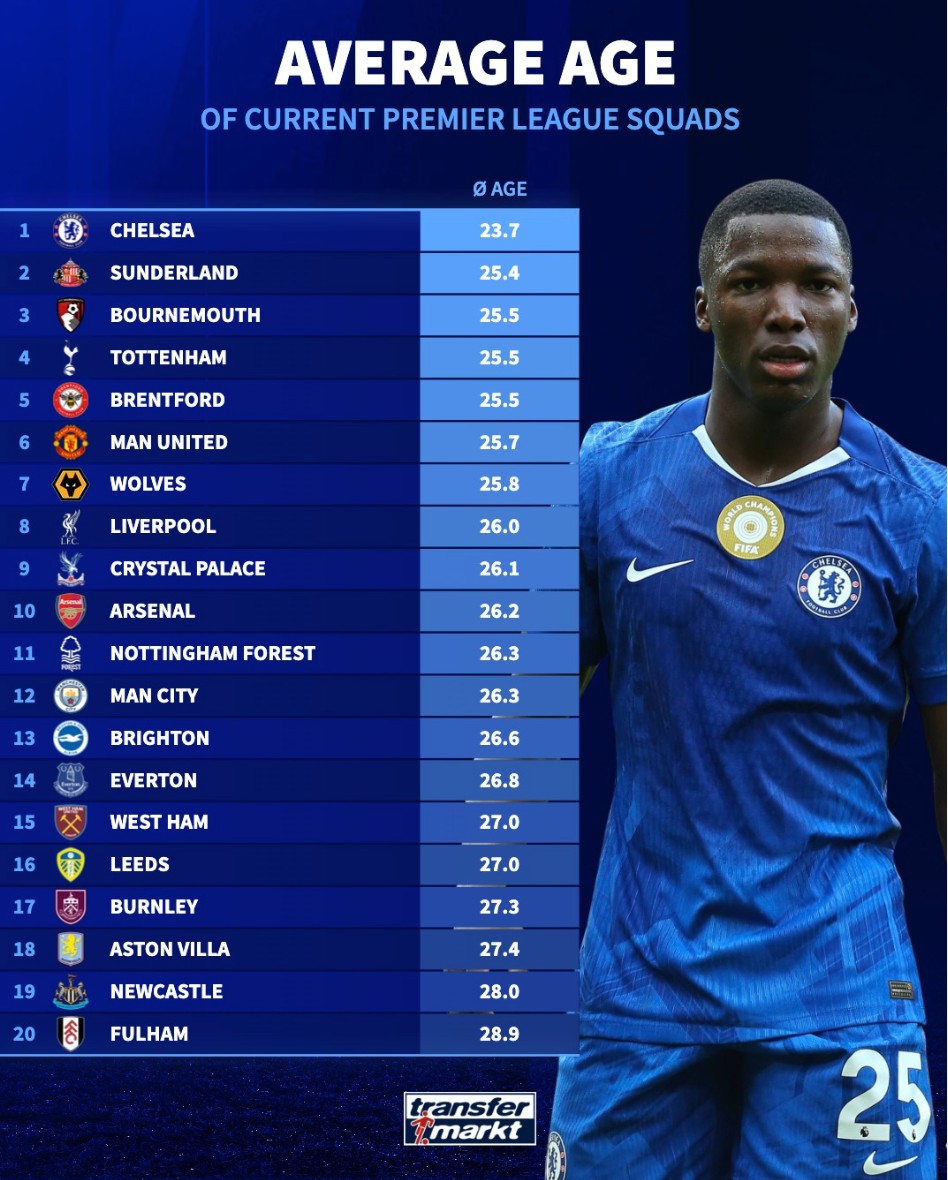 北京時(shí)間1月26日,德轉(zhuǎn)統(tǒng)計(jì)出了本賽季英超20支球隊(duì)的平局年齡,切爾西的現(xiàn)有陣容平均年齡僅為23.7歲,為英超最年輕球隊(duì),富勒姆28.9歲為平均年齡最年長(zhǎng)的球隊(duì)。