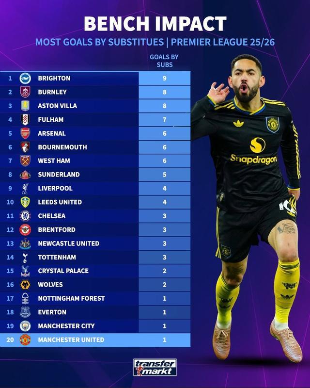 在馬特烏斯-庫尼亞對陣阿森納打入制勝球之前,曼聯(lián)是本賽季英超唯一一支替補球員沒有進球的球隊。