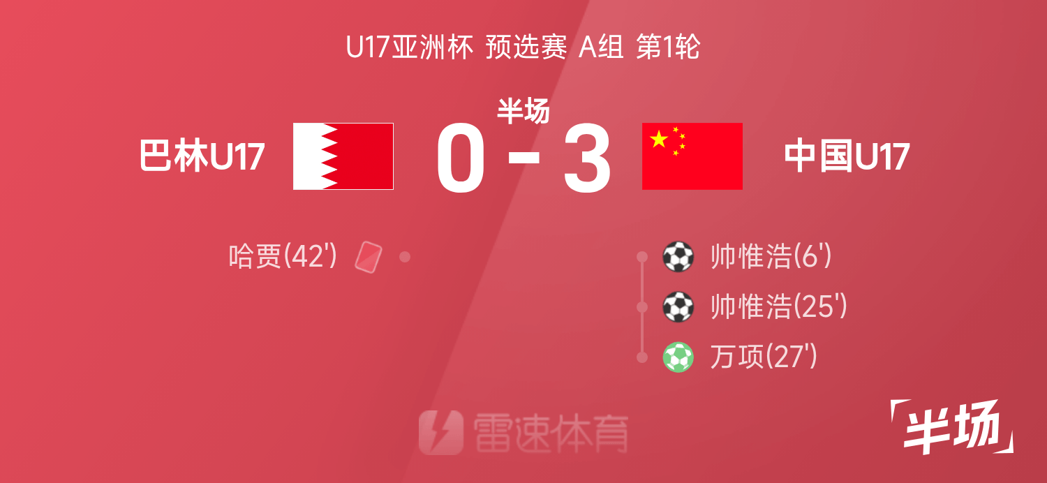 雷速體育11月22日訊 25/26賽季U17亞洲杯預選賽A組第1輪,巴林U17迎戰(zhàn)中國U17。半場戰(zhàn)罷,中國U17暫3-0領先巴林U17,帥惟浩上演梅開二度,萬項造點并主罰命中,哈賈染紅。