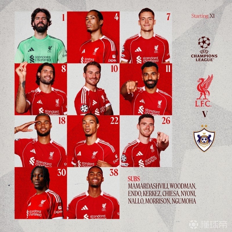 利物浦首發(fā):1-阿利松、30-弗林蓬、26-羅伯遜、4-范戴克、38-赫拉芬貝赫、10-麥卡利斯特、8-索博斯洛伊、18-加克波、11-薩拉赫、7-維爾茨、22-埃基蒂克
