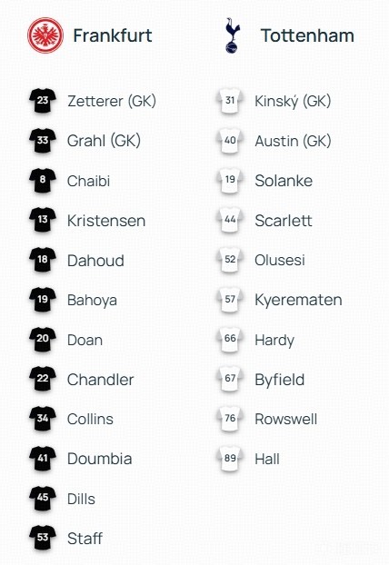 北京時間1月29日04:00,歐冠 聯(lián)賽階段第8輪,法蘭克福主場迎戰(zhàn)托特納姆熱刺,賽前雙方球隊首發(fā)名單公布如下: