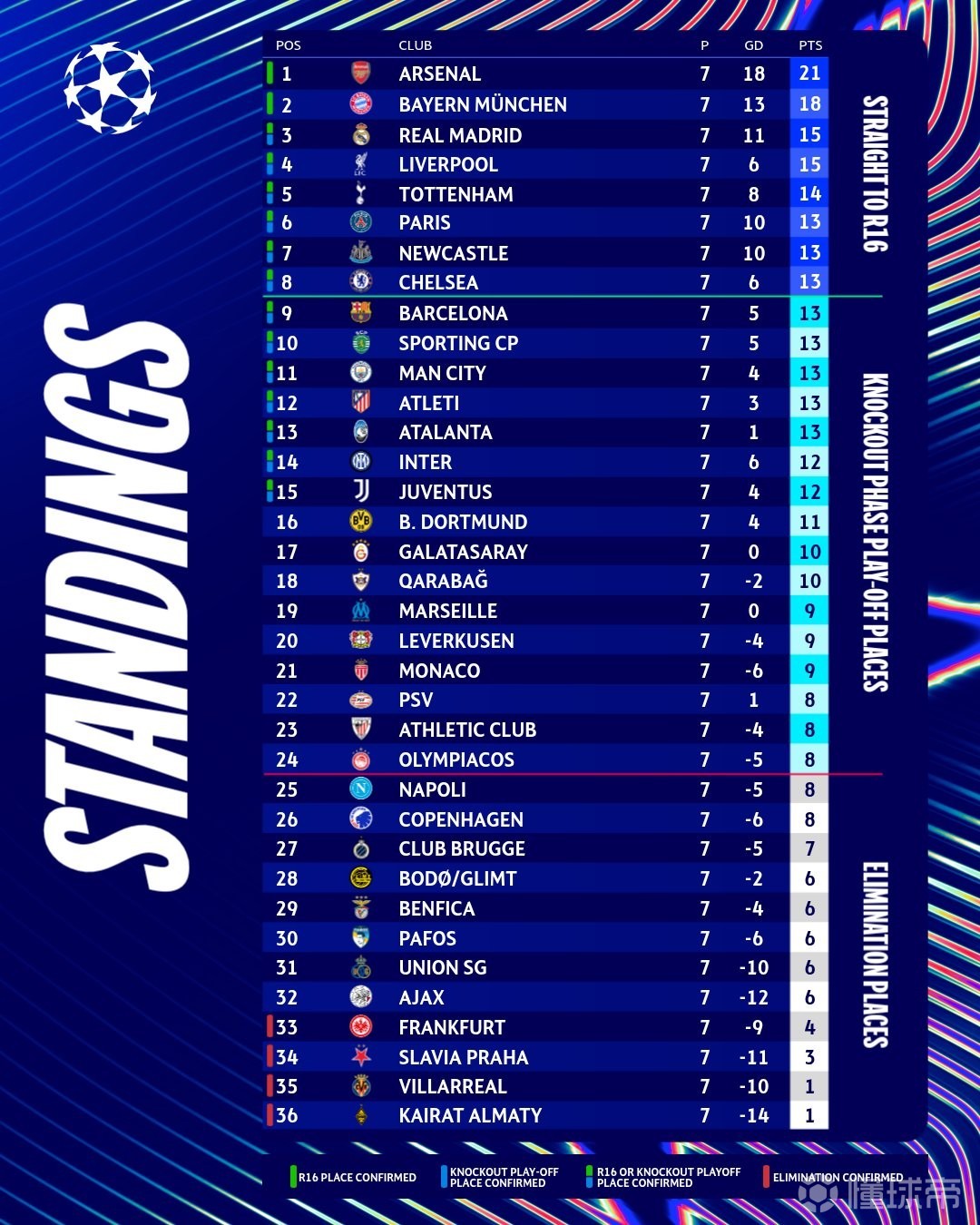 北京時(shí)間1月29日,歐冠聯(lián)賽階段最后一輪18場(chǎng)比賽全部結(jié)束了上半場(chǎng)的爭(zhēng)奪。上半場(chǎng)結(jié)束后,曼城進(jìn)入前八名,切爾西掉出前八名。西甲雙雄皇馬、巴薩目前都暫時(shí)落后,分別掉至第5和第13。