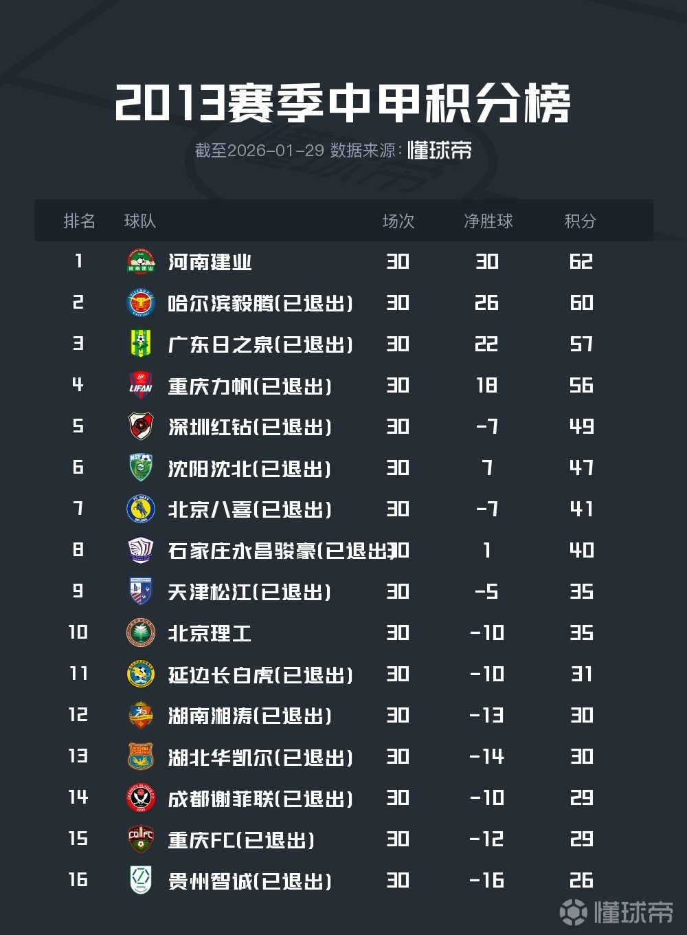 2013年參加中甲的所有球隊(duì)里,現(xiàn)存球隊(duì)僅剩河南建業(yè)(河南)和北京理工,其中河南今年被扣6分并罰款60萬元,北京理工未受到處罰。