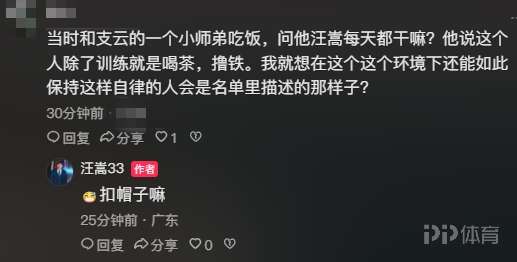 在汪嵩評論區(qū)有網(wǎng)友寫道:當(dāng)時和支云的一個小師弟吃飯,問他汪嵩每天都干嘛?他說這個人除了訓(xùn)練就是喝茶,擼鐵。我就想在這個這個環(huán)境下還能如此保持這樣自律的人會是名單里描述的那樣子?