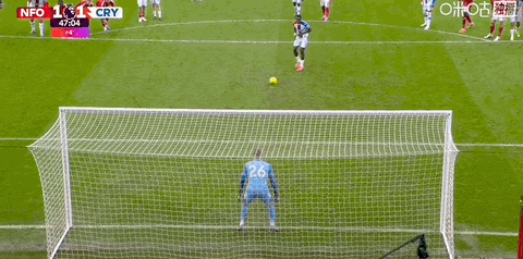 第45+1分鐘,薩爾主罰點(diǎn)球破門,水晶宮1-1扳平諾丁漢森林
