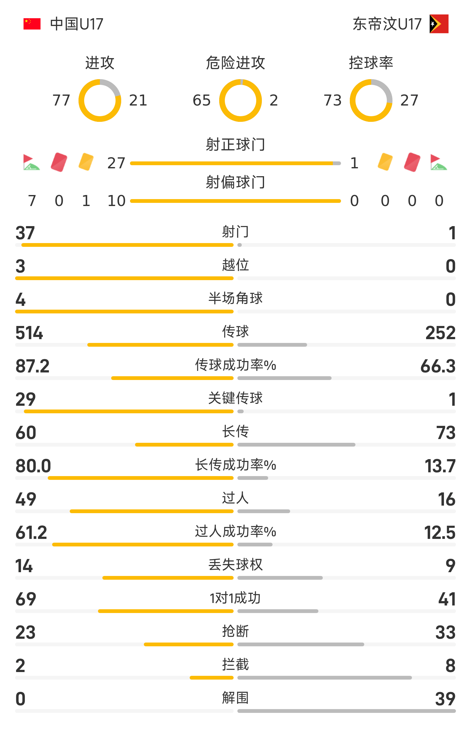 雷速體育11月24日訊 25/26賽季U17亞洲杯預(yù)選賽A組第2輪,中國U17以14-0狂勝東帝汶U17,帥惟浩、謝晉和替補登場的趙松源皆上演帽子戲法,萬項貢獻(xiàn)1射2傳,張伯霖送出雙響。中國隊在前2輪取得全勝,打進(jìn)18球保持0失球,以凈勝球優(yōu)勢力壓孟加拉,在小組里處于領(lǐng)跑。
