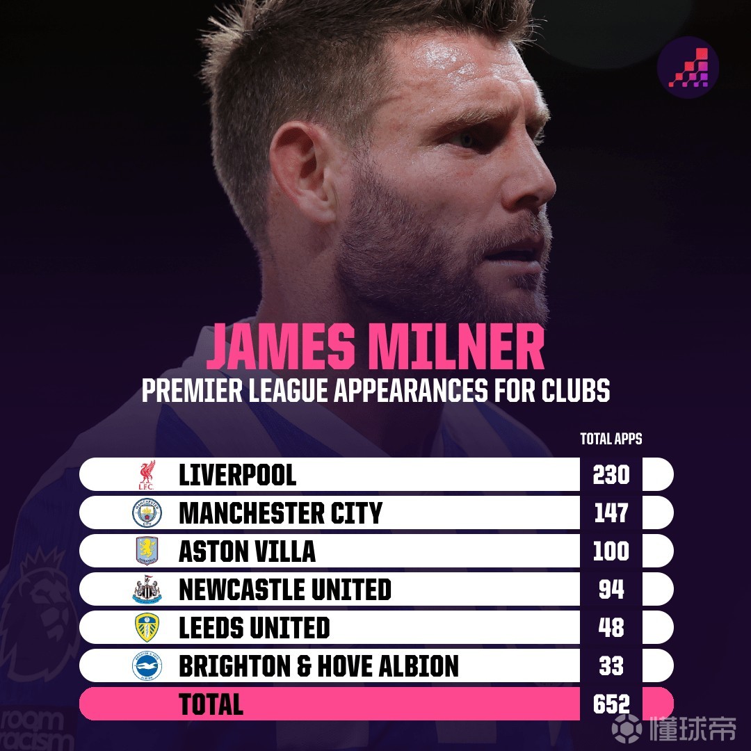 據(jù)統(tǒng)計,米爾納已經(jīng)在英超出場652次,如果周日他出戰(zhàn)水晶宮,這位40歲老將將追平由巴里保持的英超歷史出場紀錄(653場)。