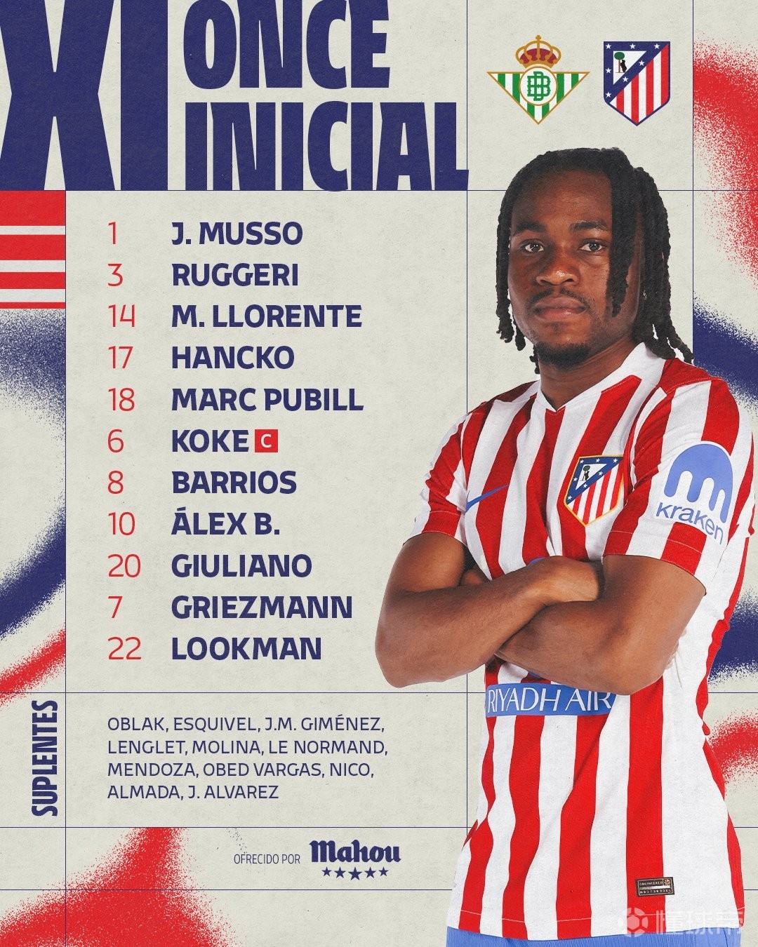 馬德里競技即將在西班牙國王杯1/4決賽客場挑戰(zhàn)皇家貝蒂斯,目前他們已經(jīng)公布了本場比賽的首發(fā)陣容。