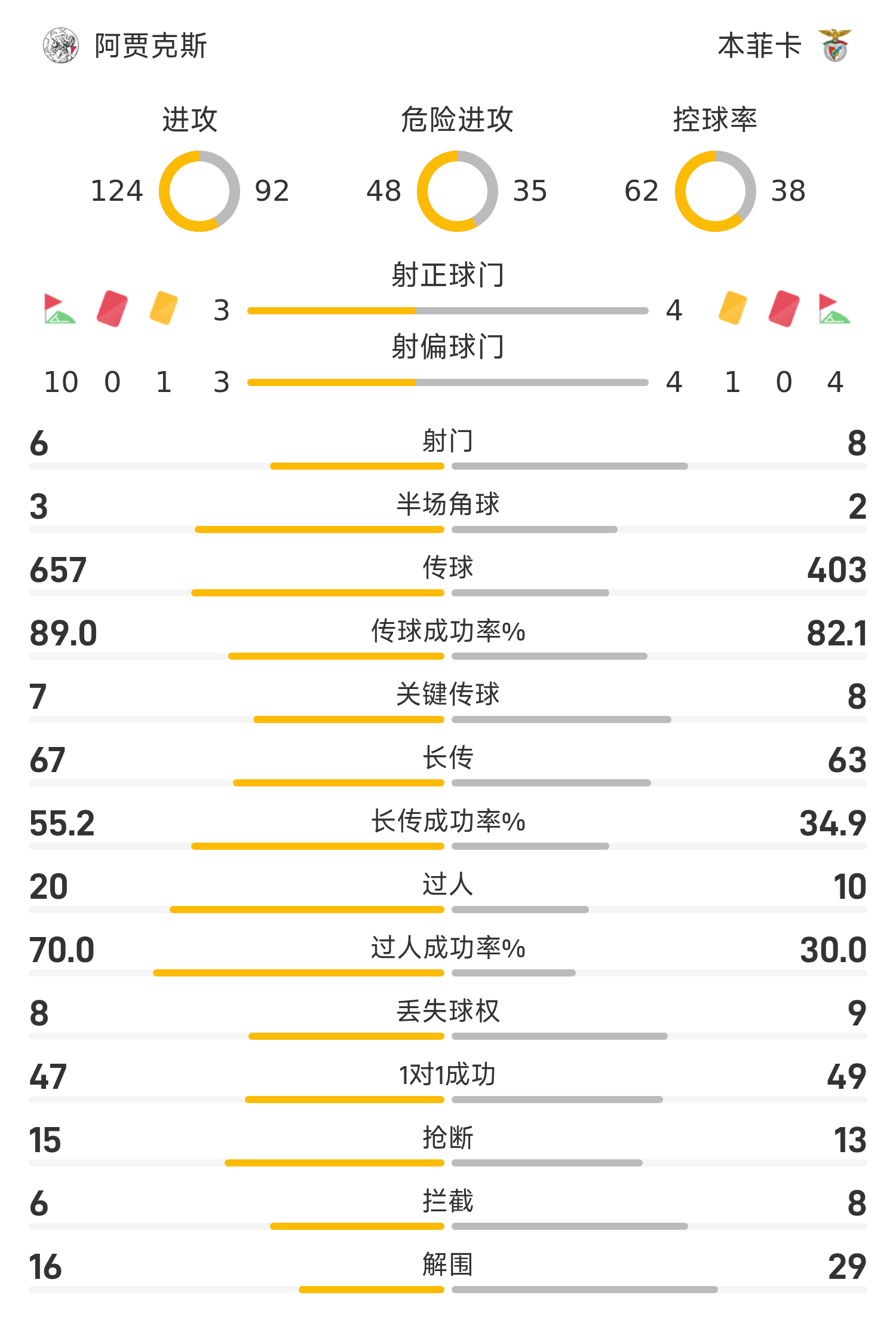雷速體育11月26日訊 25/26賽季歐冠聯(lián)賽第5輪,本菲卡2-0戰(zhàn)勝阿賈克斯。開場僅6分鐘,達(dá)爾禁區(qū)內(nèi)抽射破門,幫助本菲卡取得領(lǐng)先。領(lǐng)先后的本菲卡選擇退縮防守,盡管阿賈克斯創(chuàng)造出了不少機(jī)會,但由于門前把握機(jī)會能力欠佳,始終未能扳平比分。比賽最后時刻,巴雷羅反擊破門,將比分改寫為2-0,幫助本菲卡鎖定勝局。