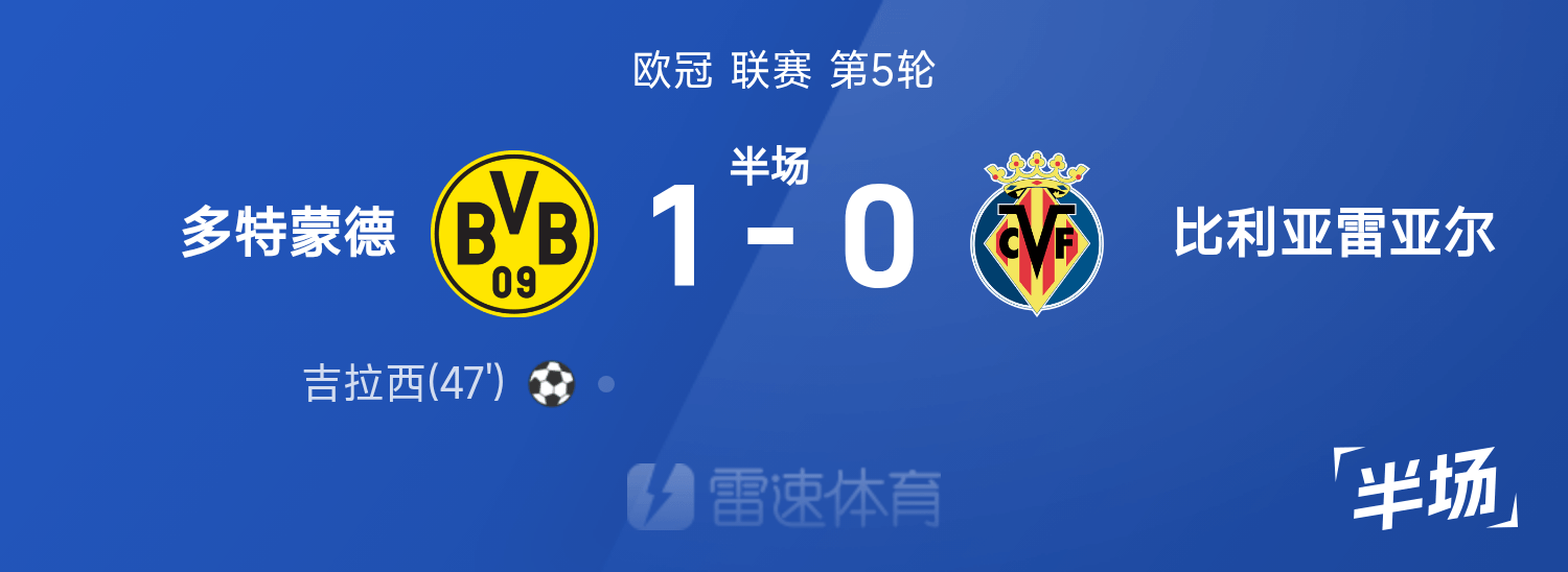 雷速體育11月26日訊 25/26賽季歐冠聯(lián)賽第5輪,多特蒙德迎戰(zhàn)比利亞雷亞爾。半場戰(zhàn)罷,雙方比分暫為多特蒙德1-0比利亞雷亞爾,吉拉西補時階段頭球破門建功。