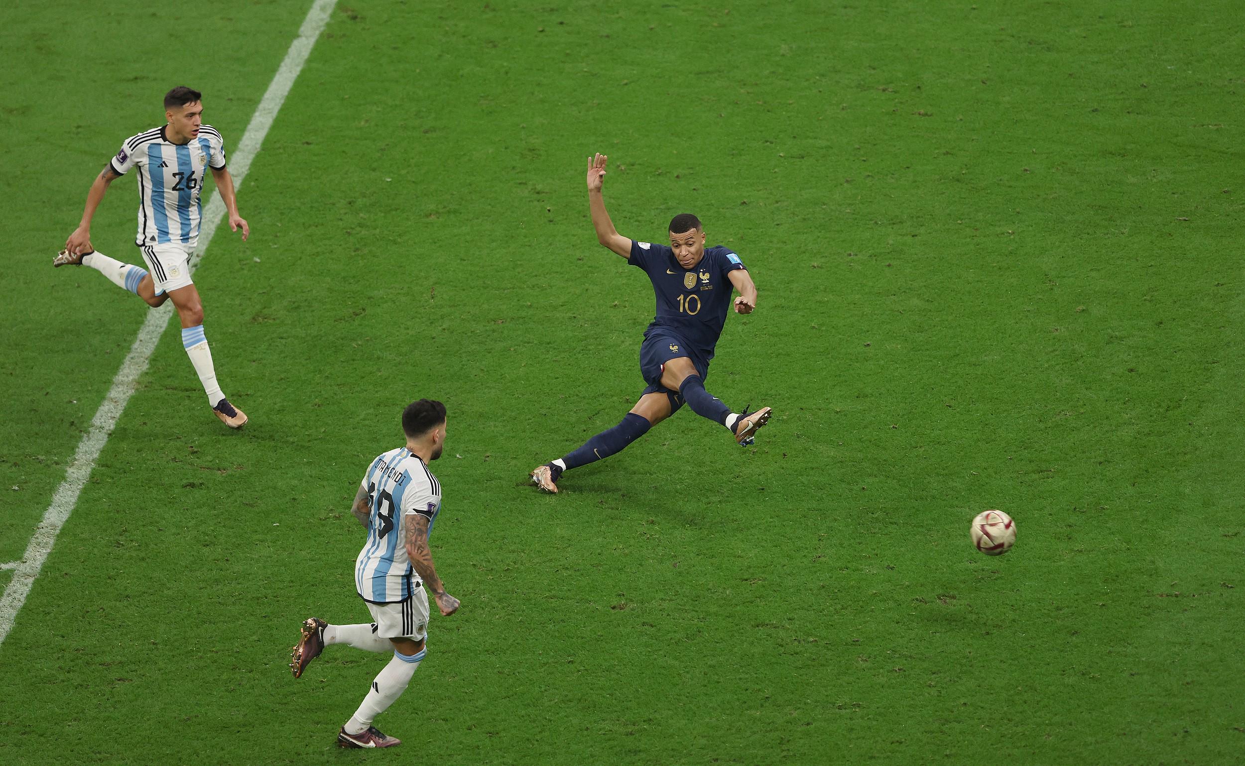 2022年12月18日,世界杯決賽,法國半場0-2落后阿根廷。第80分鐘,姆巴佩點球扳回一城。97秒后,姆巴佩與小圖拉姆打出配合,隨后高難度凌空臥射破門,為法國隊扳平了比分!