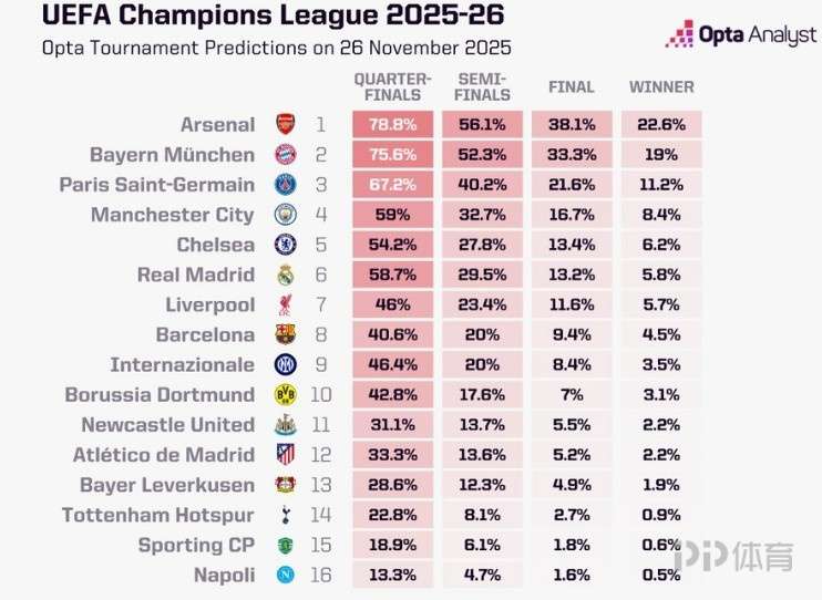 本輪歐冠戰(zhàn)罷,數(shù)據(jù)網(wǎng)站OPTA也更新了本賽季歐冠奪冠概率,其中阿森納最被看好。