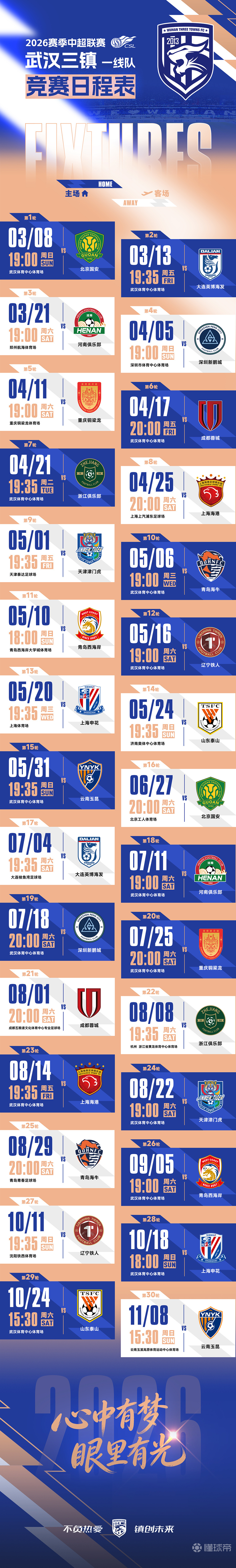 2月14日,2026怡寶中國足球超級聯(lián)賽對陣日程表出爐。武漢三鎮(zhèn)將以“兩連主”開啟新賽季征程,3月8日,三鎮(zhèn)隊將在聯(lián)賽首輪中迎接北京國安的挑戰(zhàn)。11月8日,三鎮(zhèn)隊將前往客場與云南玉昆進行聯(lián)賽收官戰(zhàn)。心中有夢、眼里有光,讓我們一起為武漢而戰(zhàn)! 武漢三鎮(zhèn)隊競賽日程如圖,請查收~
