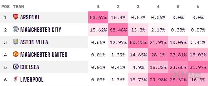 數(shù)據(jù)機(jī)構(gòu)Opta的超級計算給出了最新的排名預(yù)測:阿森納贏下北倫敦德比后,奪冠概率回升至83.67%,曼城則是15.62%。