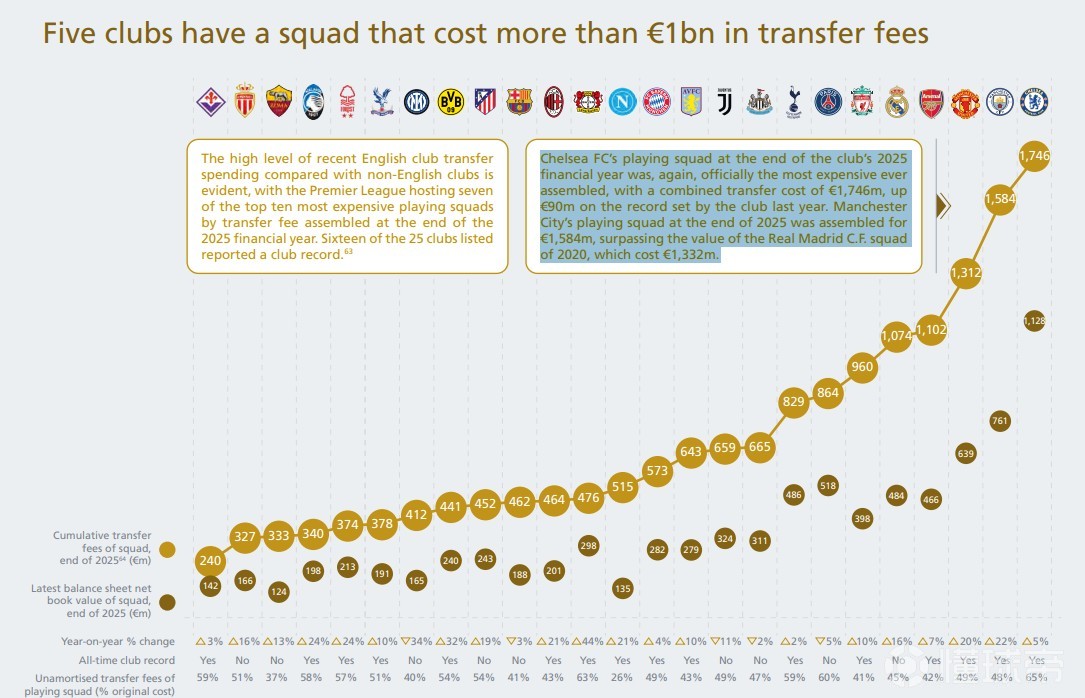“截至2025財年,切爾西的一線隊陣容以17.46億歐元的累計轉(zhuǎn)會成本,正式成為歷史上組建成本最高的陣容,比俱樂部去年創(chuàng)下的紀錄高出9000萬歐元。”