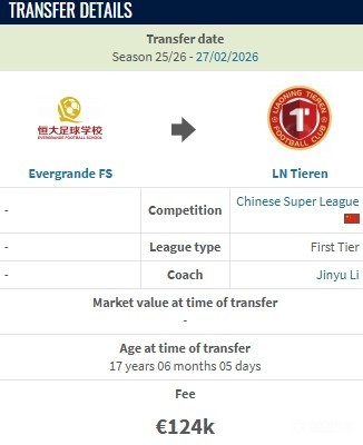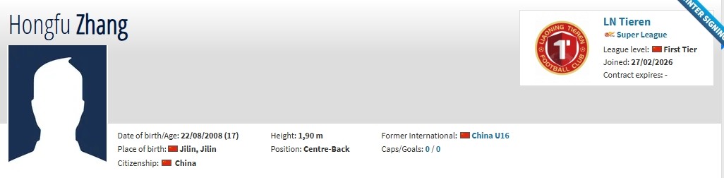 北京時(shí)間2月27日,德轉(zhuǎn)更新,遼寧鐵人約100萬人民幣簽下恒大足校17歲后衛(wèi)張洪福。