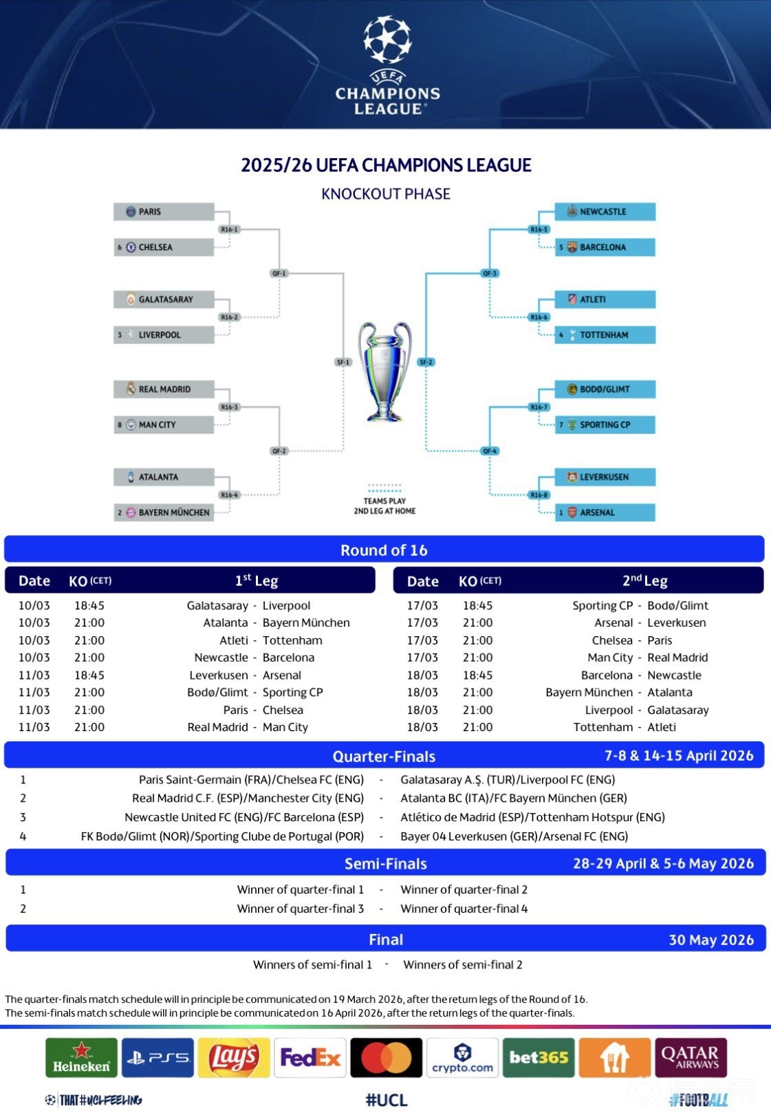 北京時(shí)間2月27日,在歐冠淘汰賽抽簽結(jié)束后,歐足聯(lián)官方已經(jīng)確認(rèn)了1/8決賽全部16場(chǎng)比賽的開球時(shí)間。其中皇馬與曼城的兩回合比賽將分別于北京時(shí)間3月12日4:00和3月18日4:00進(jìn)行。
