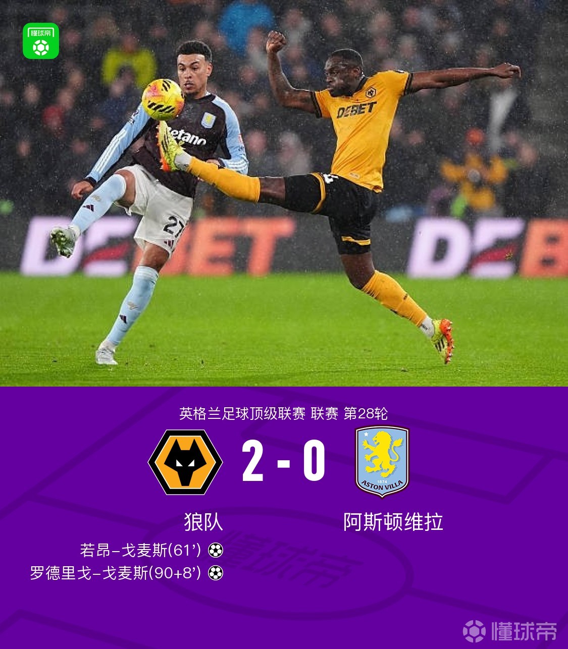 北京時(shí)間2月28日英格蘭足球頂級(jí)聯(lián)賽 聯(lián)賽 第28輪,狼隊(duì)主場(chǎng)對(duì)陣阿斯頓維拉。上半場(chǎng),兩隊(duì)均無建樹。下半場(chǎng),若昂-戈麥斯打破僵局。讀秒階段,羅德里戈-戈麥斯破門鎖定勝局。全場(chǎng)比賽結(jié)束,維拉0-2不敵狼隊(duì),遭遇各項(xiàng)賽事三場(chǎng)不勝。