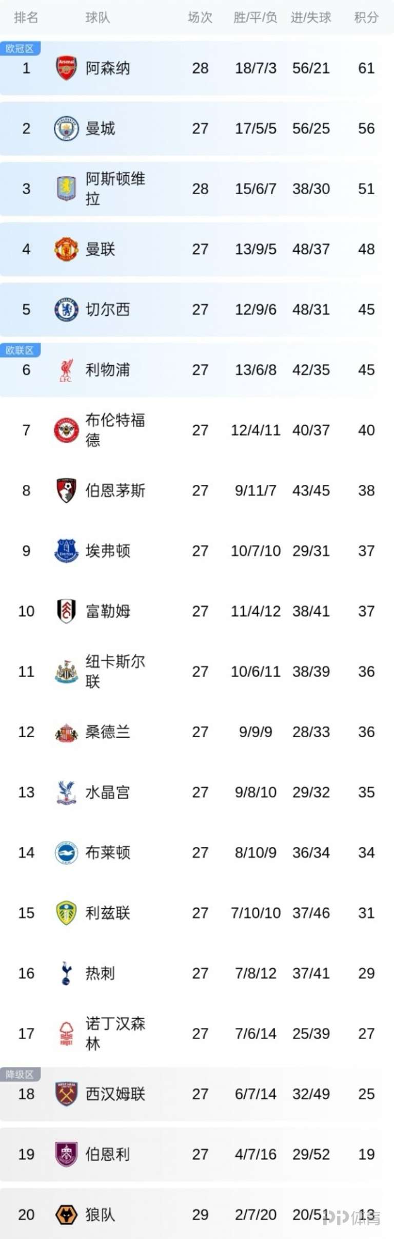 英超第28輪,維拉客場0-2爆冷不敵狼隊,目前多賽一場領(lǐng)先身后的曼聯(lián)3分,領(lǐng)先排名第6暫位歐聯(lián)區(qū)的利物浦6分。