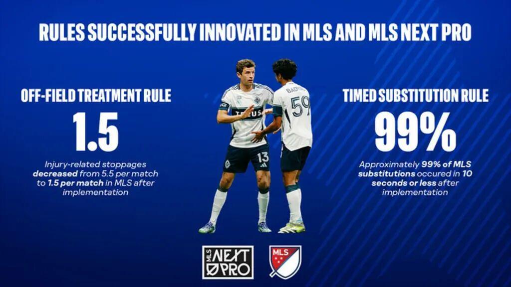 這兩項(xiàng)規(guī)則2024年在北美大聯(lián)盟試行,2025年進(jìn)入墨西哥聯(lián)賽參與的聯(lián)賽杯。兩項(xiàng)新規(guī)在減少拖延比賽時(shí)間方面,效果立竿見影。北美大聯(lián)盟因球員受傷導(dǎo)致的比賽暫停次數(shù)減少72%,場均5-6次降到1.5次。2025賽季北美大聯(lián)盟510場比賽合計(jì)4346次換人,僅有12次違反“10秒限時(shí)換人”規(guī)則,有效加快了比賽節(jié)奏。
