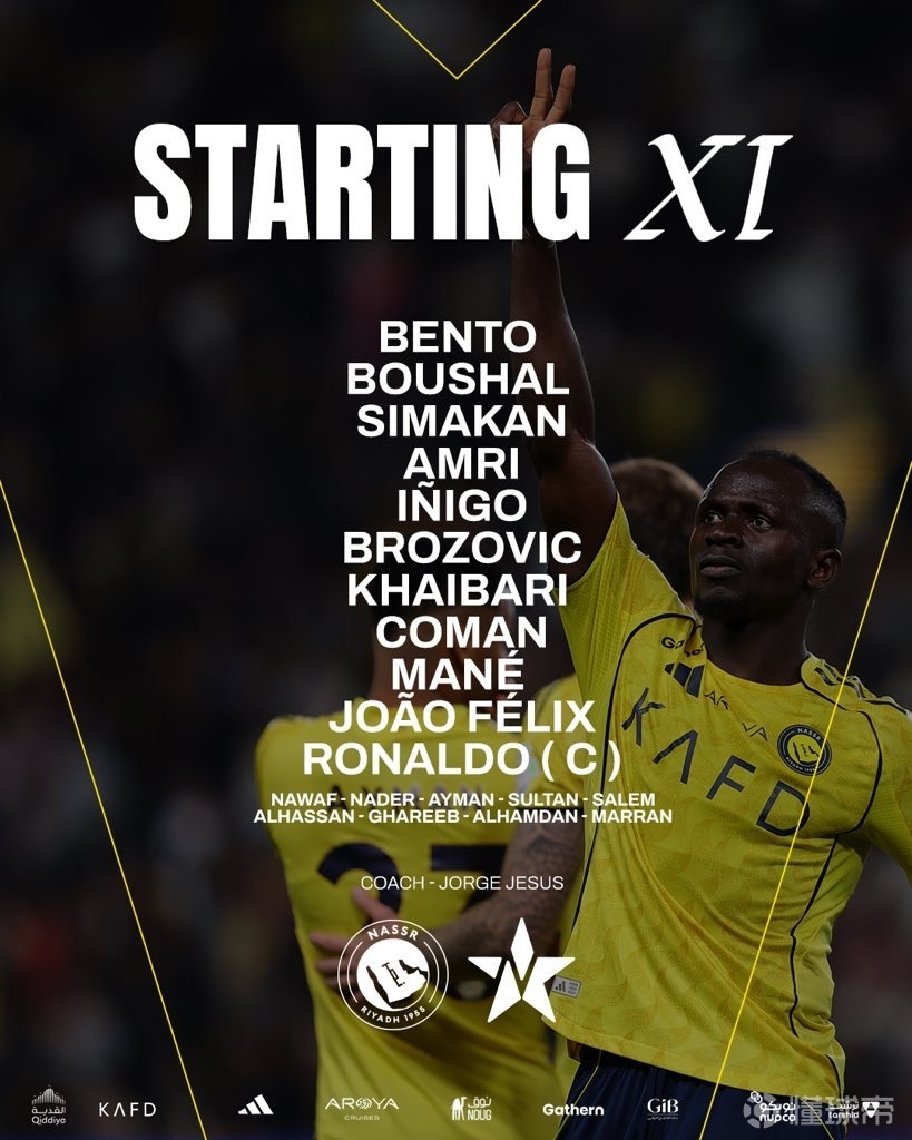 利雅得勝利首發(fā):24-本托、12-納瓦夫-布歇爾、3-西馬坎、5-阿卜杜拉-阿姆里、26-伊尼戈-馬丁內(nèi)斯、17-阿卜杜拉-海巴里、11-布羅佐維奇、21-金斯利-科曼、10-馬內(nèi)、79-菲利克斯、7-C羅