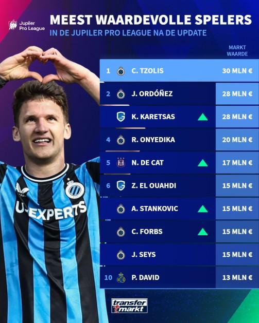 北京時間12月10日,在更新了比甲的球員身價之后,德轉(zhuǎn)統(tǒng)計(jì)出了比甲目前身價排名前10的球員,布魯日6人入圍,希臘邊鋒措利斯3000萬歐元第一,國際米蘭舊將亞歷山大-斯坦科維奇上榜,此外亨克的18歲新星卡雷察斯以及安德萊赫特的17歲新星德卡特同樣榜上有名。