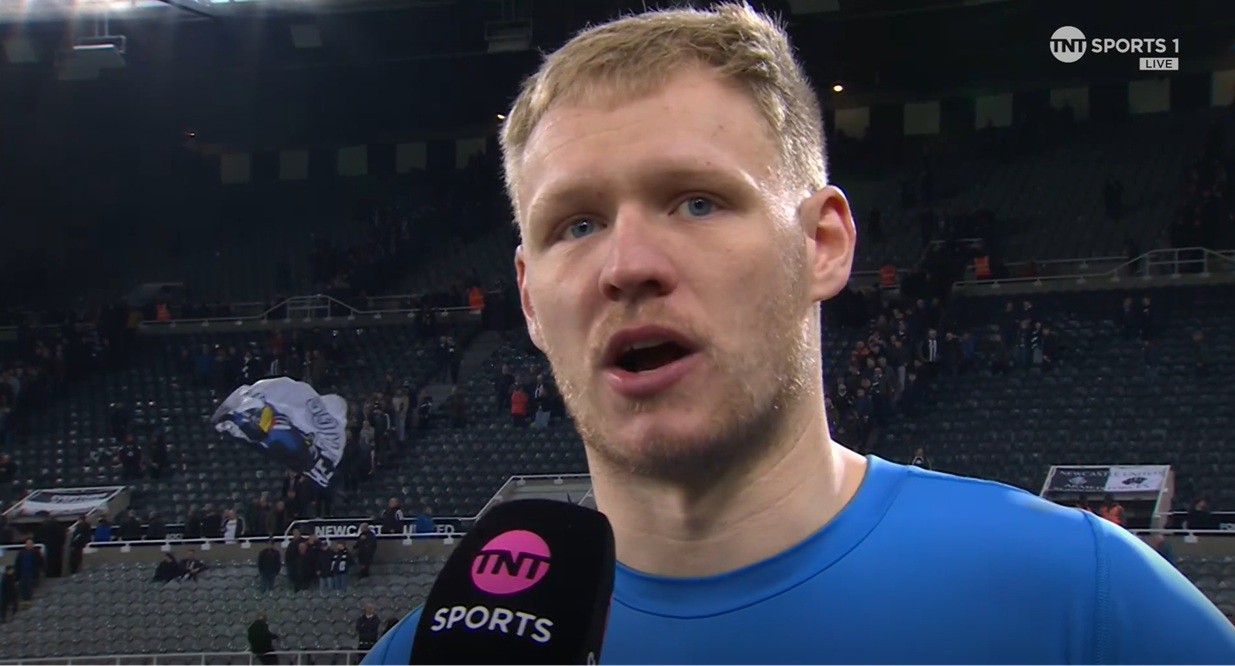 英超第29輪一場較量,紐卡主場2-1擊敗了曼聯(lián)。賽后,奉獻(xiàn)上佳表現(xiàn)的門將拉姆斯代爾接受了TNT體育的采訪。
