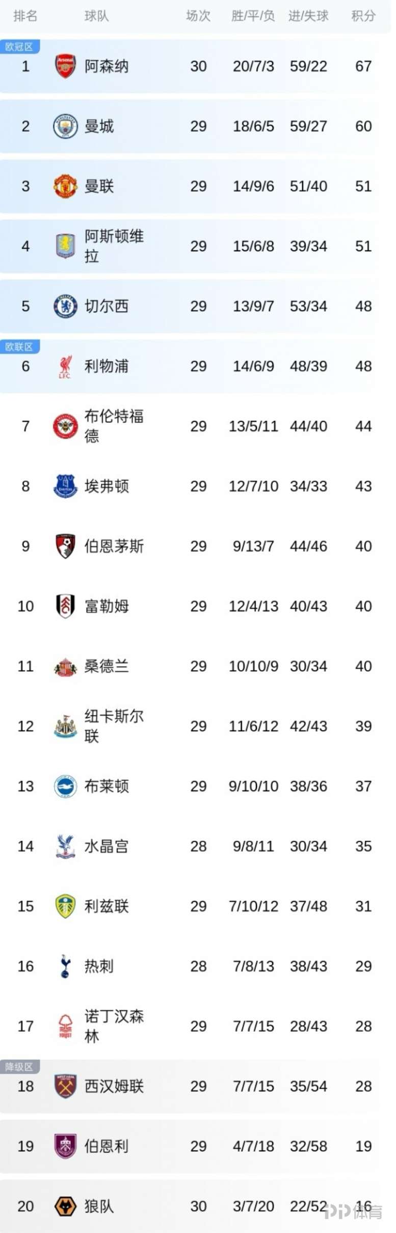 目前,阿森納的67分領(lǐng)先曼城60分,位列第三的曼聯(lián)與第六名利物浦分差僅3分。降級(jí)區(qū)西漢姆聯(lián)、伯恩利和狼隊(duì)仍處于保級(jí)壓力之下,排名最后的狼隊(duì)以16分深陷降級(jí)區(qū)。