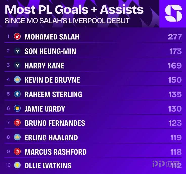Squawka數(shù)據(jù)統(tǒng)計(jì),自薩拉赫完成利物浦首秀以來他在英超已參與277球,同期斷崖領(lǐng)先: