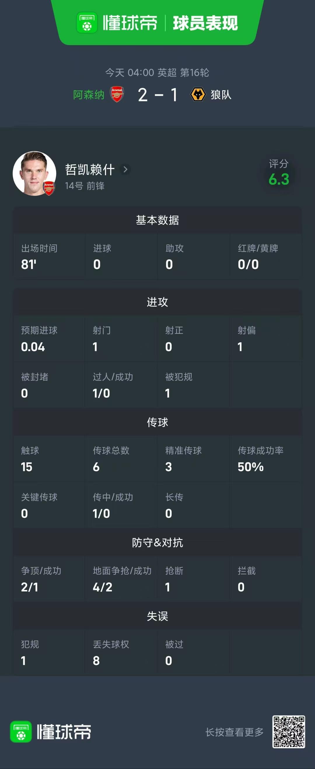 本場(chǎng)比賽,槍手前鋒哲凱賴什首發(fā)出戰(zhàn)81分鐘,1次射門0次射正,在場(chǎng)上僅觸球15次。其他數(shù)據(jù)方面,哲凱賴什0次成功過(guò)人,6次傳球3次成功,8次丟失球權(quán)。