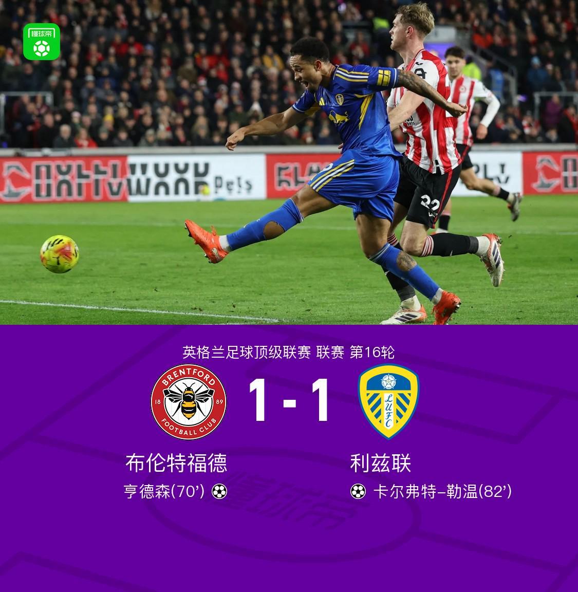 第83分鐘,尼奧托傳中,勒溫頭球破門,利茲聯(lián)1-1布倫特福德