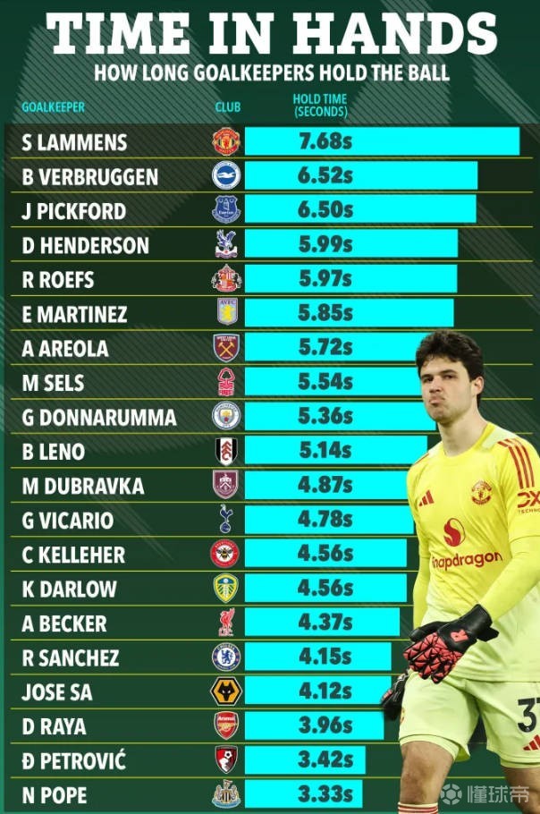 本賽季,英超采用了新規(guī)則,門將被禁止雙手持球超過8秒鐘,否則會判給對手角球,而根據(jù)統(tǒng)計,拉門斯的平均持球時間比聯(lián)賽中任何其他守門員都要長,但仍在8秒以內(nèi)——他每次撿球或接球時平均持球時間為7.68秒,僅比限制少0.32秒。