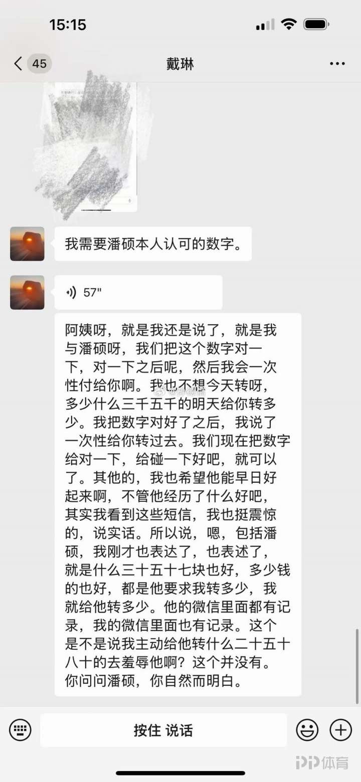 媒體人表示:“戴琳在潘碩icu昏迷新聞出來(lái)后,不停和潘碩母親說(shuō)等潘碩醒來(lái)對(duì)對(duì)賬,可他之前都是認(rèn)賬的,10月初聊天記錄里戴琳自己確認(rèn)數(shù)額的(圖一),這周一卻要和潘碩母親對(duì)賬(圖二),明擺著要賴賬啊”。