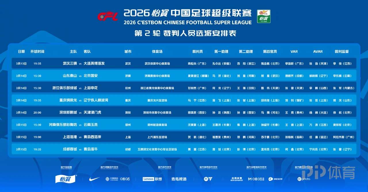 中超聯(lián)賽官方公布了第二輪裁判安排,具體人選如下。